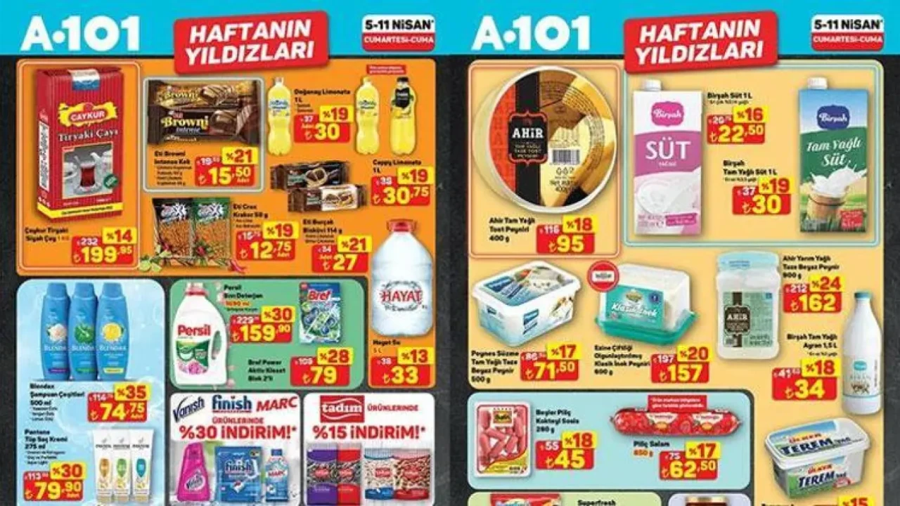 A101 mağazalarında her hafta Cumartesi günü satışa sunulan indirimli ürünler vatandaşların yakın takibinde yer alıyor. Yayımlanan Haftanın Yıldızları kataloğu aracılığı ile mağaza raflarında satışa sunulan ürünler arasında bu hafta Çay, Şampuan, Deterjan, Sabun, Molped çeşitlerinde % 50 indirim, Kaşar Peyniri, Süt, Klasik İnek Peyniri, Reçel gibi ürünler indirimli olarak satışta. İşte 5-11 Nisan yeni A101 aktüel indirimleri...