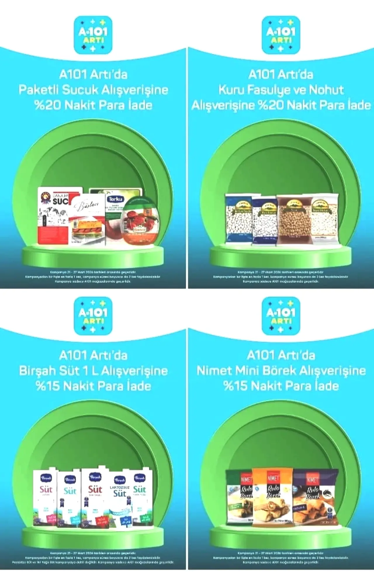 A101+ platformunda, paketli sucuk, kuru fasulye ve nohut alımlarında %20, Birşah süt 1 L ve Nimet mini börek alımlarında %15 nakit iade fırsatı sunulmakta.