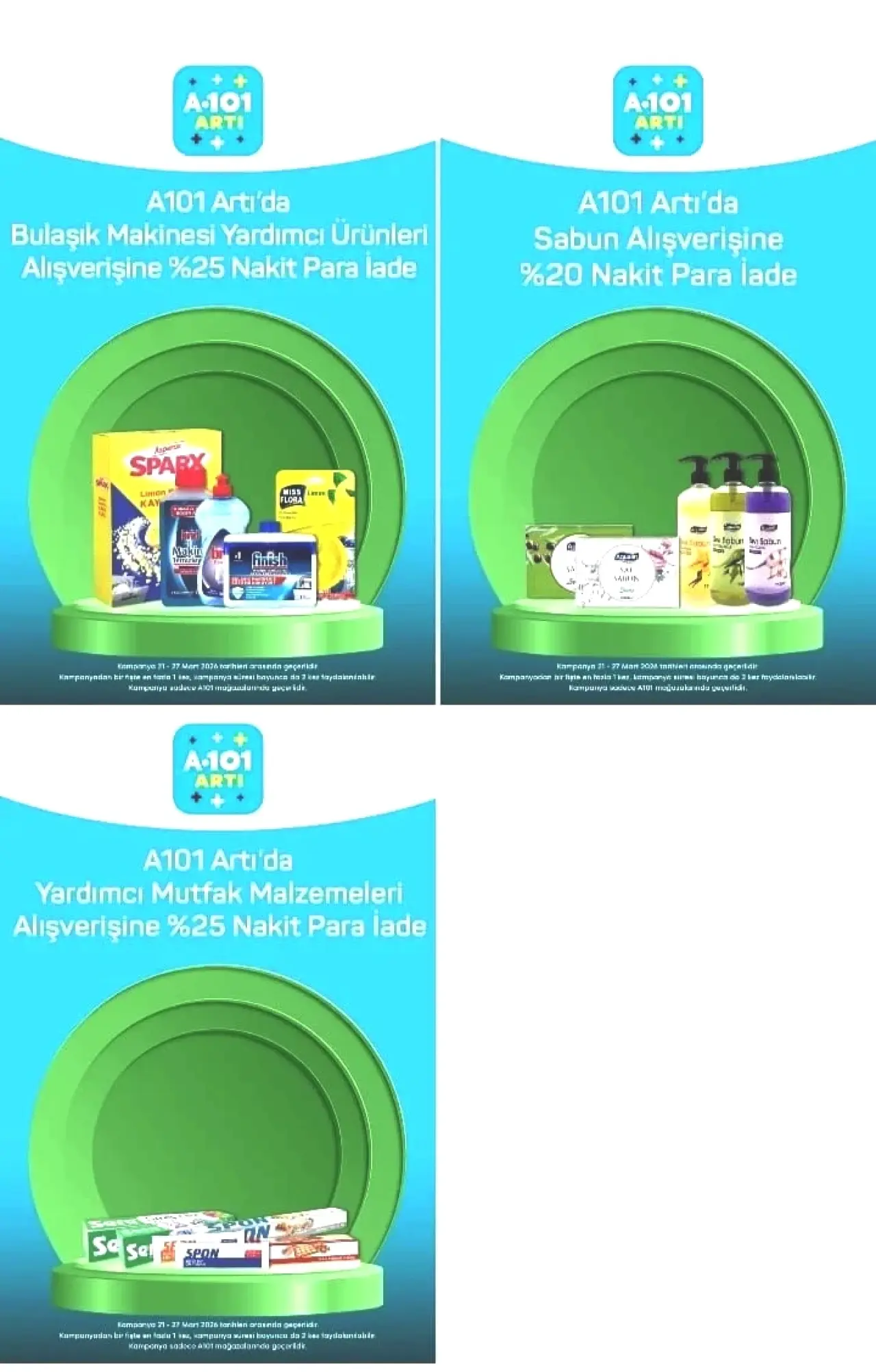 A101+’da bulaşık makinesi yardımcı ürünleri için %25, sabun ve mutfak malzemeleri alımlarında %25 nakit geri ödeme imkanı bulunuyor.