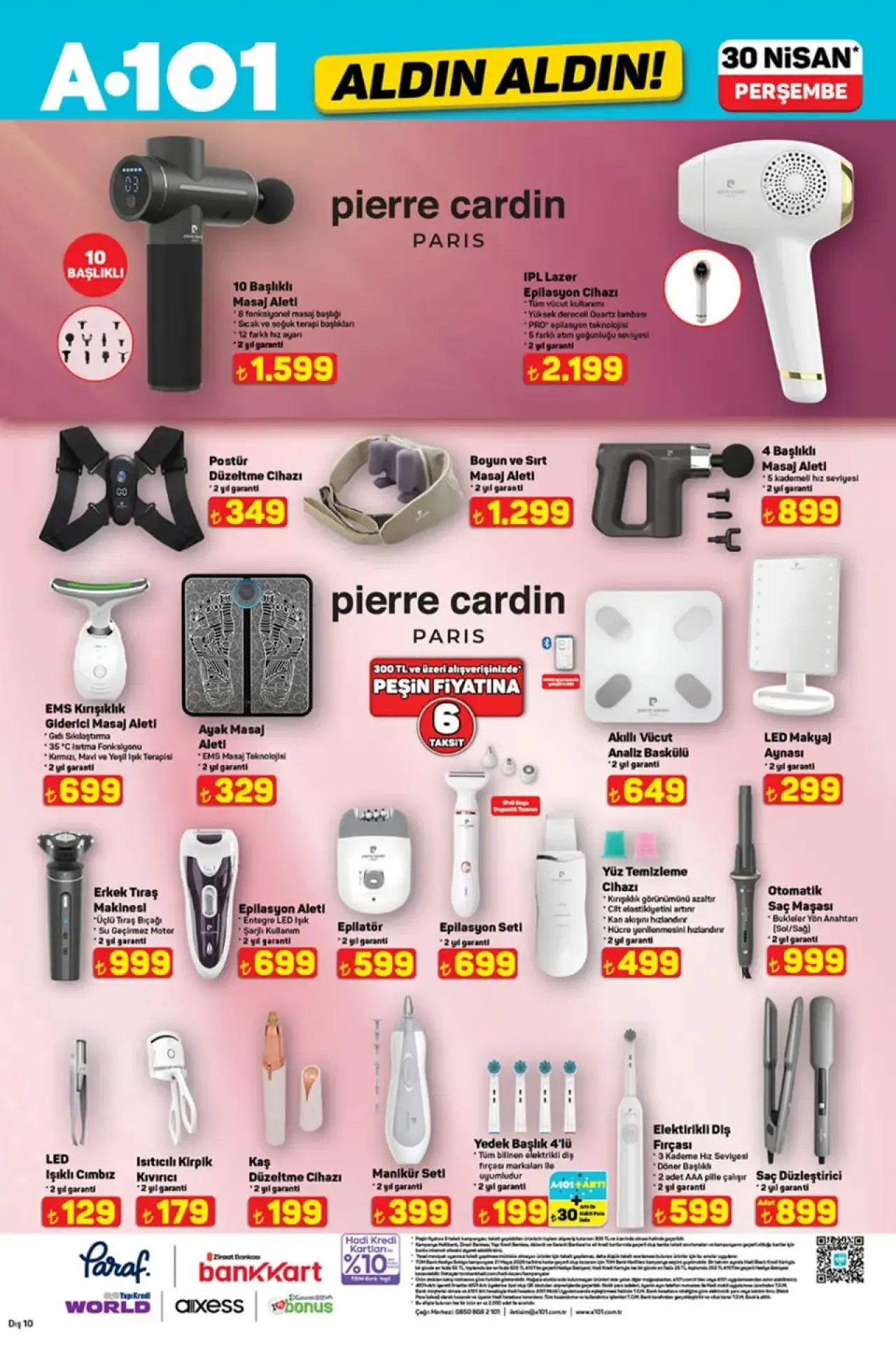 A101 Aktüel 30 Nisan 2026 kataloğunun en zengin bölümlerinden birini ise kişisel bakım ve tekstil ürünleri oluşturuyor. Raflarda geniş bir Pierre Cardin koleksiyonu görüyoruz: 10 farklı başlığı bulunan şarjlı masaj aleti 1.599 TL, 5 kademeli hız seviyesine sahip otomatik saç maşası ve yüksek dereceli Quartz lambalı IPL Lazer Epilasyon cihazı 2.199 TL ile öne çıkıyor. Cilt ve saç bakımı için vegan formüllü Dermokil çay ağacı yağı yüz temizleme jeli, Daily Perfection argan ve E vitaminli saç bakım yağları indirimli fiyatlarla sunuluyor. Tekstil reyonunda %100 pamuklu kumaşıyla Hummel erkek ve kadın tişörtleri 249 TL, orijinal lisanslı Zorluteks lastikli çarşaflar ve taraftar lisanslı pikeler kaliteli dokularıyla A101 30 Nisan indirimlerine dahil oluyor. JUNO markalı yüksek tabanlı ve çift tokalı terlik çeşitleri ile Pierre Cardin ortopedik visco yastık da katalogdaki yerini alıyor.