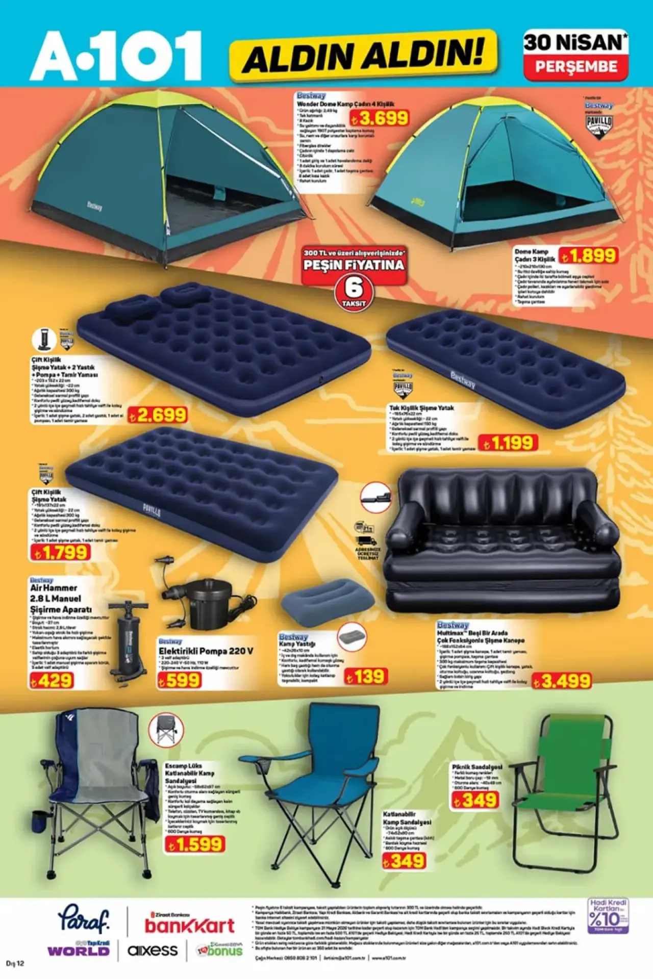 A101 30 Nisan 2026 kataloğu özellikle motorlu taşıtlar ve doğa sporları ekipmanlarıyla oldukça iddialı bir yelpaze sunuyor. Ulaşım alternatiflerini değerlendirenler, elektirkli ve benzinli motosikletler arayanlar için 36 km menzilli ve 1000W motor gücüne sahip APEC APM2 Üç Tekerlekli Elektrikli Moped 44.990 TL’den, 105 km/h azami hıza ulaşabilen sıvı soğutmalı Revolt RSX7 150 CC Benzinli Motosiklet ise 99.990 TL’den alıcılarını bekliyor. Kamptan vazgeçemeyenler için 4 kişilik kapasitesiyle Bestway Wonder Dome kamp çadırı 3.699 TL, çift kişilik şişme yataklar ve Escamp lüks katlanabilir kamp sandalyeleri A101 aktüel katalog sayfalarında dikkat çeken diğer ürünler arasında. Ev içi temizlik donanımları tarafında ise 899 W motor gücü ve HEPA filtre sistemiyle English Home Cyclone Süpürge 3.999 TL; güçlü leke temizleme özellikli 1000 W motorlu Sinbo koltuk ve halı yıkama makinesi 5.999 TL’lik fiyatıyla A101 30 Nisan kampanyalarının ağır toplarını temsil ediyor.