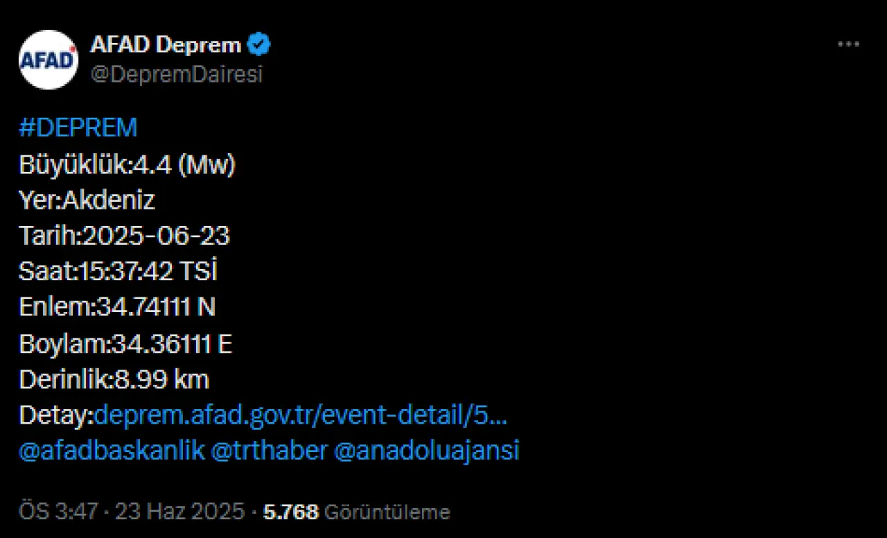 Akdeniz'de 4.4 büyüklüğünde bir deprem meydana geldi.