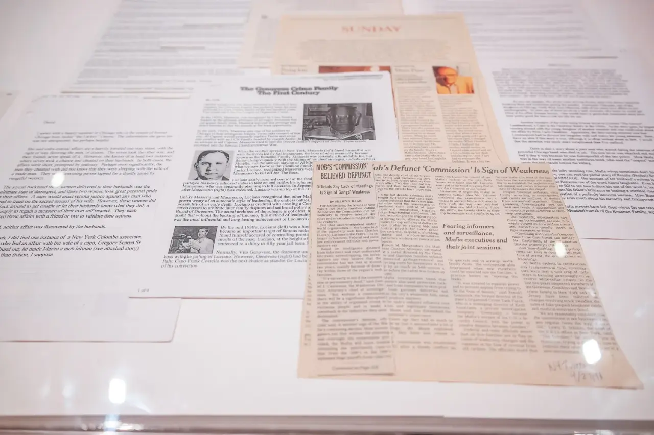At its heart is a display case shows the team frantically swatting up on their knowledge of the Italian-American underworld in the months leading up to the filming of the pilot. There are clippings on the Genovese crime family, notes titled “Wiseguy Research,” and a document assigning characters their place within the mafia hierarchy. Chase may have been inspired by the northern New Jersey community he grew up in, but the research went deep. In one case, someone probes their connections in the Chicago crime network to learn about marital infidelity. “The wives look the other way,” the source reports.