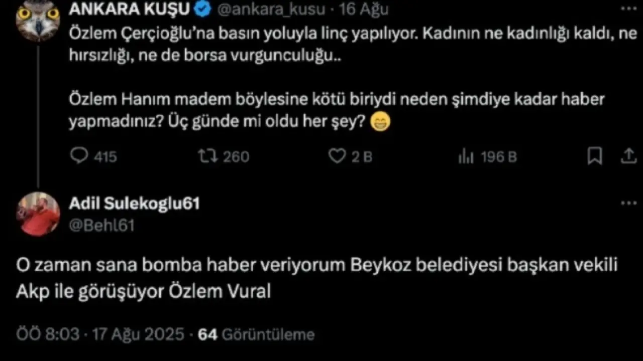 Sosyal medyada Adil Şülekoğlu isimli bir kişi Ankara Kuşu isimli X hesabının bir paylaşımına, “O zaman sana bomba haber veriyorum Beykoz belediyesi başkan vekili Akp ile görüşüyor Özlem Vural” ifadeleriyle yanıt verdi.