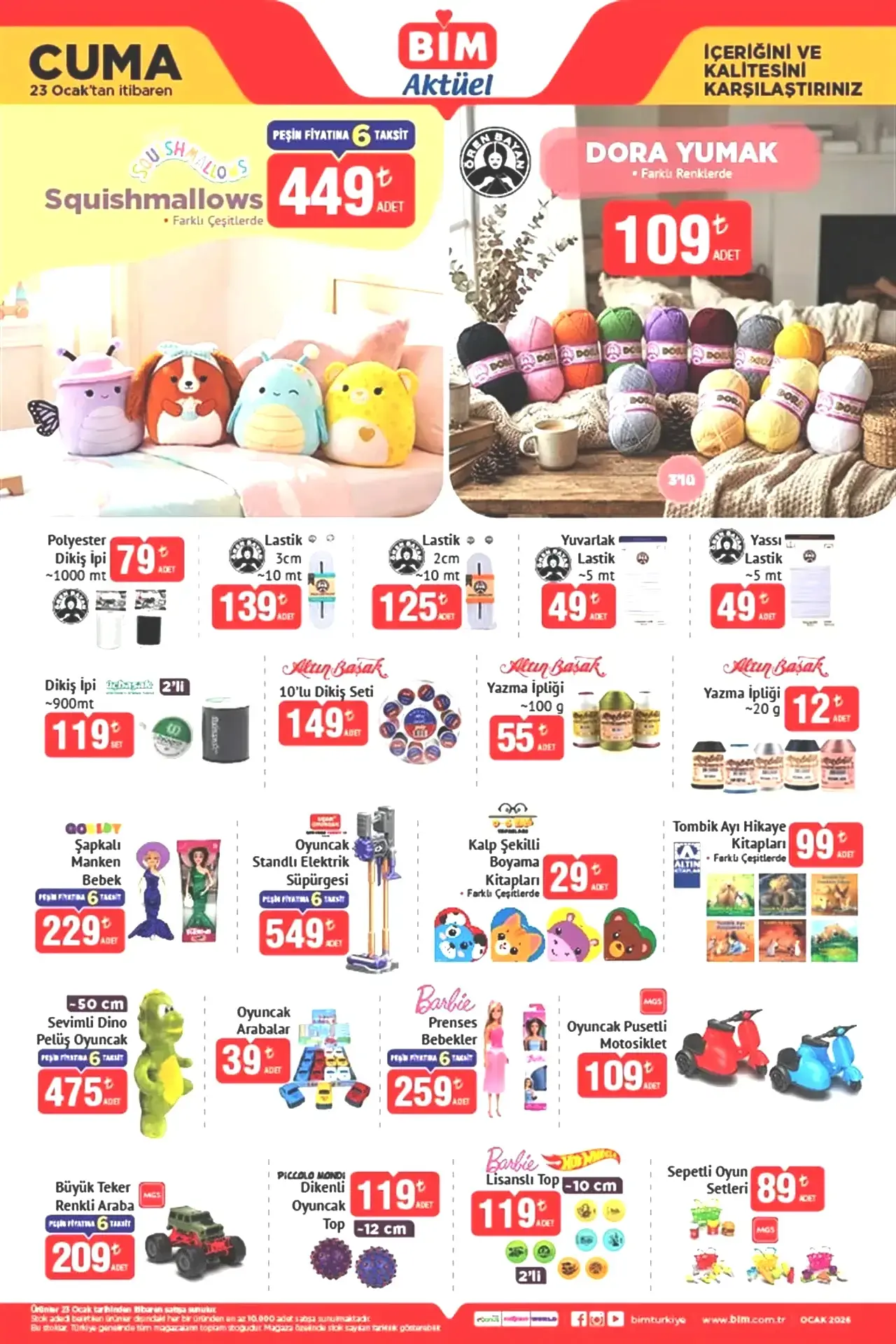 BİM’in 23-30 Ocak aktüel kataloğu raflarda yerini aldı. Cuma günü indirimlerden yararlanmak isteyenler BİM market önünde uzun kuyruklar meydana getiriyor. Kampanya kapsamında televizyon, buharlı temizleme makinesi, mutfak gereçleri ve giyim ürünleri gibi pek çok seçenek bulunuyor. Bu hafta BİM’de Dijital Mikrodalga Fırın 2.490 TL, Mini Blender Set 1.490 TL, Turbo Beyaz Cam Ankastre Set 9.990 TL gibi ürünler yer alırken, pilates/yoga ekipmanlarında da indirimler sürüyor. 30 Ocak kataloğunda ise Buharlı Temizleme Makinesi 4.750 TL, Dondurma Yapabilen Hamur Makinesi 2.990 TL, Mini Fırın 1.990 TL, Saç Kurutma Makinesi 699 TL ve Turbo Fan Süpürge 4.490 TL’den satışa sunulacak. BİM’de bu cuma neler olduğunu keşfedin!