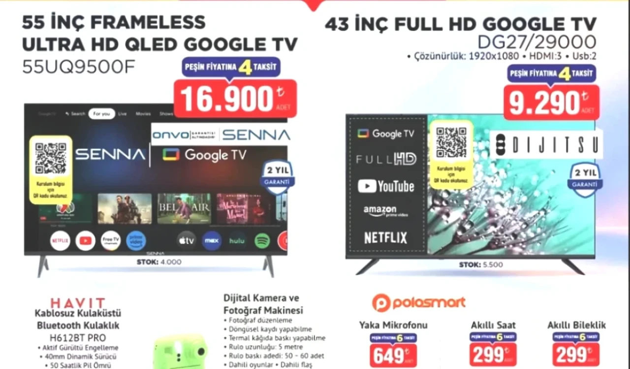 No Frost Buzdolabı: 27.900 TL 9 Kg Çamaşır Makinesi: 14.900 TL 4 Programlı Bulaşık Makinesi: 13.900 TL 3 Kapaklı Raflı Kahve Köşesi: 4.190 TL