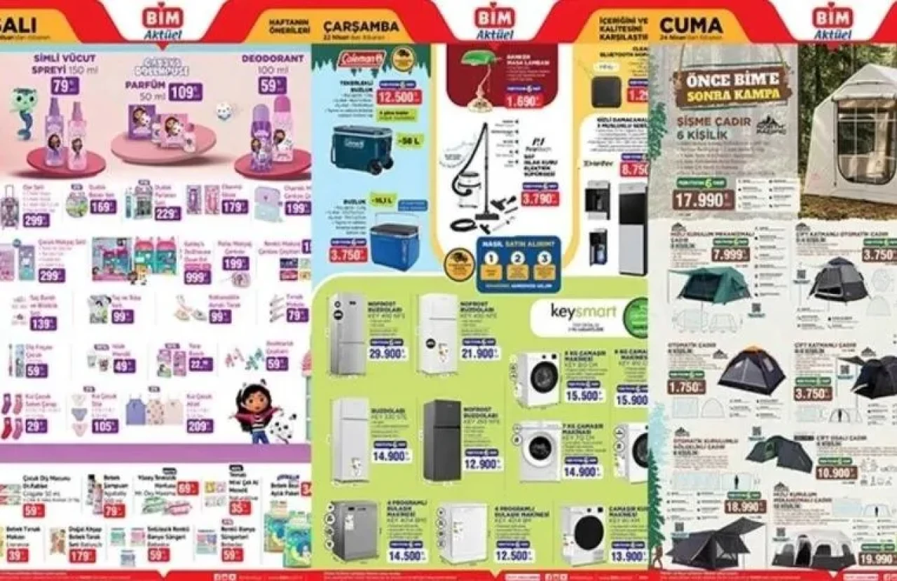 Türkiye genelinde mağazaları bulunan BİM, 21-22-24 Nisan 2026 aktüel kataloğunu müşterileri ile buluşturdu. Bu haftanın öne çıkan ürünleri arasında kamp ekipmanları, elektronik ürünler, mutfak gereçleri ve temel gıda ürünleri yer aldı. Özellikle bahar aylarının gelmesiyle birlikte kamp ve açık hava ürünlerine olan ilginin arttığı görüldü.