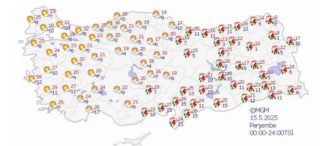 Meteoroloji Genel Müdürlüğü, 15 Mayıs Perşembe gününe ilişkin hava durumu raporunu yayımladı
