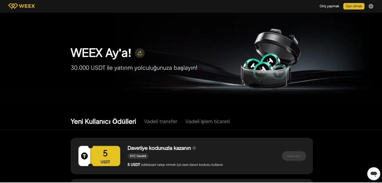 Platform ayrıca depozit işlemlerini teşvik etmek amacıyla kademeli bir yatırım bonus sistemi uygular. 100 USDT yatıran kullanıcıya 20 USDT, 500 USDT yatırana 100 USDT ve 1,000 USDT yatırana ise 200 USDT bonus verilir. Tüm bu ödüller “futures bonus” olarak sunulur ve yalnızca vadeli işlemlerde kullanılabilir.