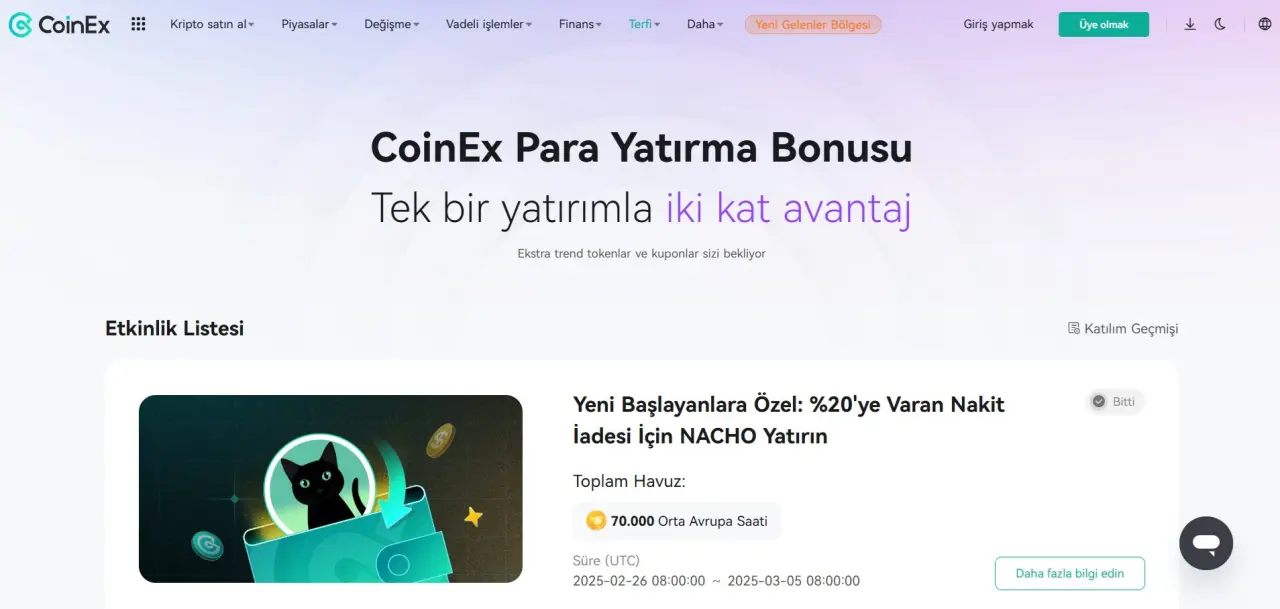 CoinEx’in yaklaşımı diğerlerinden biraz farklı: direkt bir hoşgeldin para bonusu yerine, arkadaş daveti (referans) ödülleri ile kullanıcılarına kazanç sağlıyor.