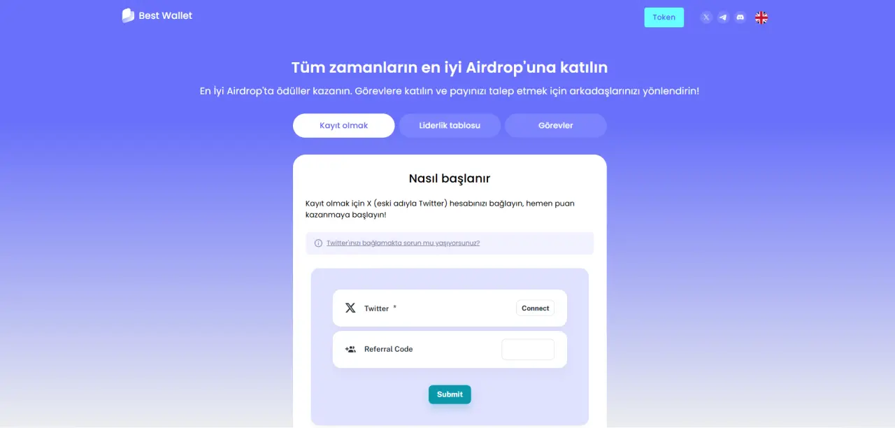 Kayıt olunca para veren borsalar arayışında olanların ilgisini çeken Best Wallet’ın hoşgeldin kampanyası ise klasik para bonusundan ziyade bir airdrop programı şeklinde. Kayıt olan ve çeşitli görevleri yerine getiren kullanıcılara $BEST adlı tokendan ödüller dağıtılıyor.