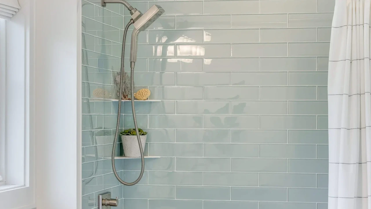 Yeşil fayanslı duşta el duşu başlığı ve bank