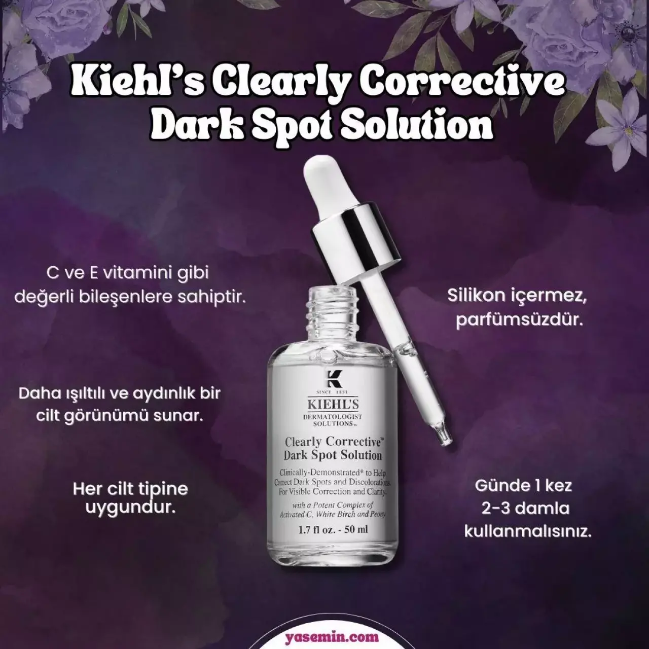Parfümsüz olmasıyla da tercih edilen Kiehl’s Clearly Corrective Dark Spot Solution, içerisinde  Şakayık özü, Salisilik Asit, Aktive Edilmiş C Vitamini barındırıyor.