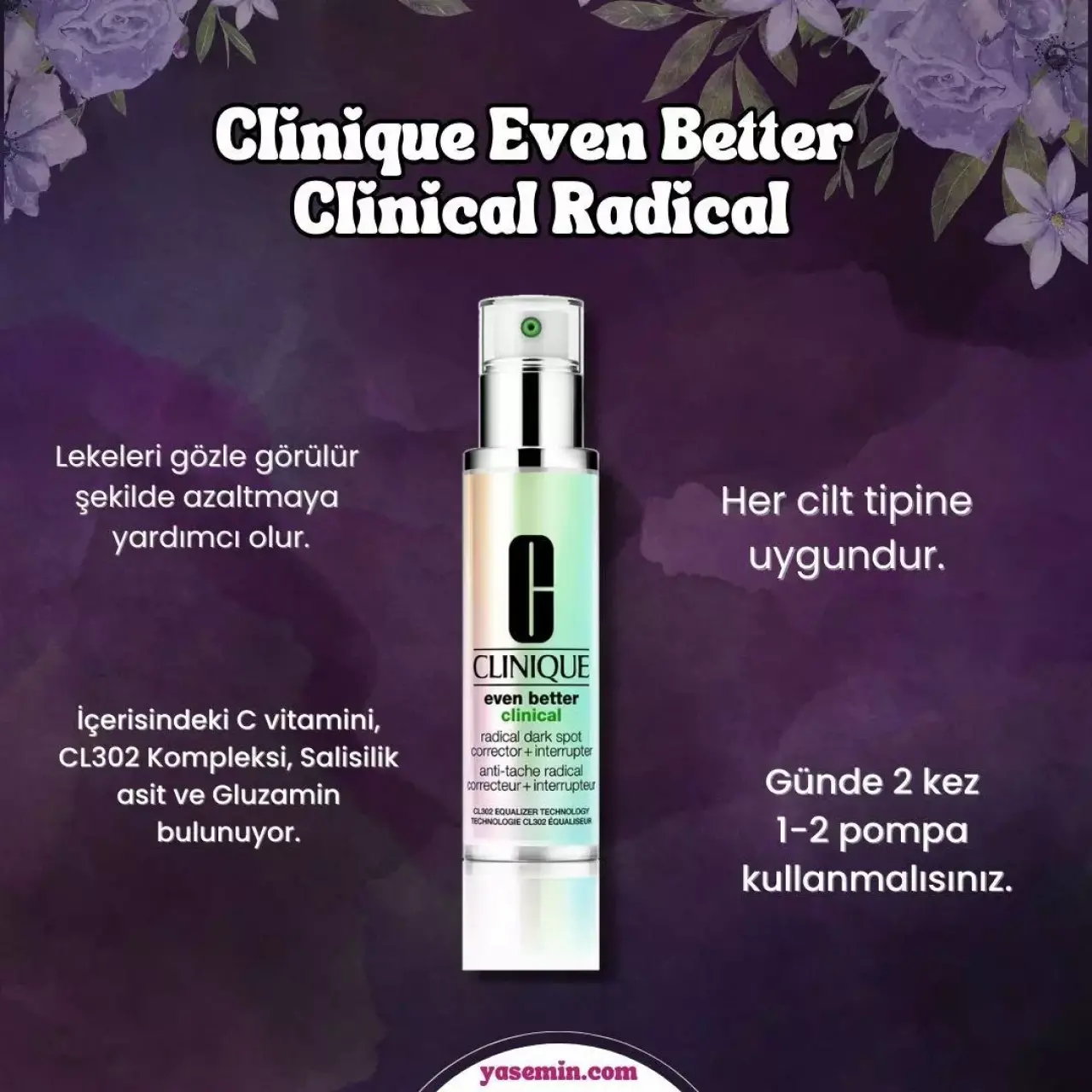 2- Clinique Even Better Clinical Radical / 985,00 TLClinique Even Better Clinical Radical, koyu lekelerle mücadele edenler için güçlü formüle sahip olan serumdur. Cildin netliğini arttırmada güçlü bir rol oynayan bu serum, nazik ve güçlü aydınlatıcı molekülümüzün iki katına sahip; yeni ve geliştirilmiş ürün formülü ile lekelere karşı savaşır. Günde 2 kez, sabah ve akşam kullanılan Clinique Even Better Clinical Radical serum, aynı zamanda yeni leke oluşumunu önlemeye de yardımcı olur.