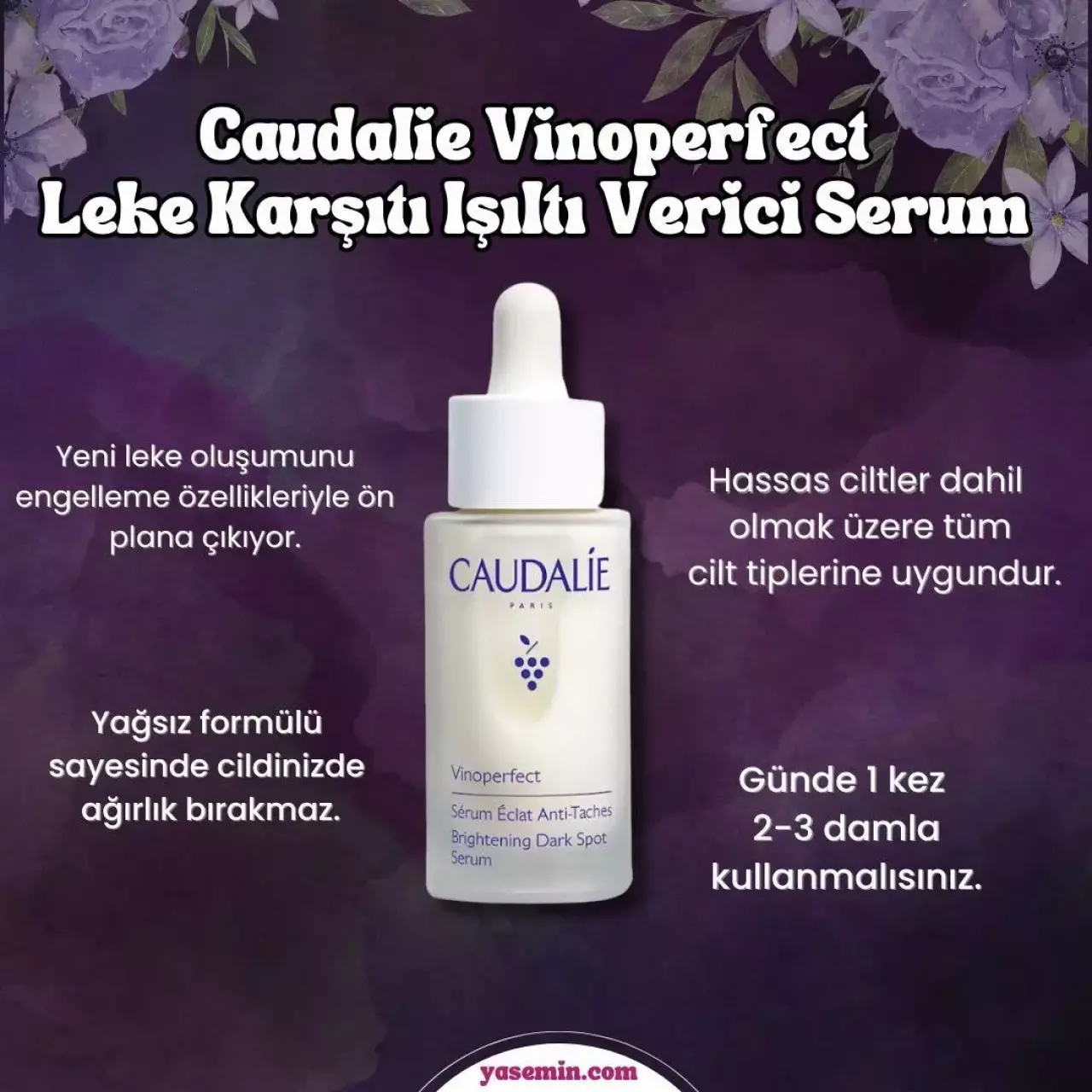 Daha aydınlık bir cilt için lekelerin görünümünü azaltır ve yeni lekelerin oluşumunu önleyen Caudalie Vinoperfect Leke Karşıtı Işıltı Verici Serumun içerisinde Zeytin Skualeni, Viniferine barındırıyor.