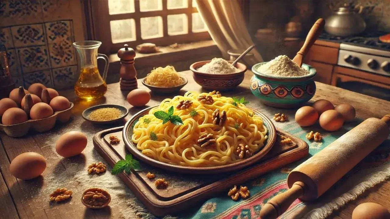 Reştiyye Eriştesi Tarifi İçin Gerekli Malzemeler 4 su bardağı un 120 gram tulum peyniri 150 gram tereyağı 120 gram ceviz içi 6 adet yumurta 1 yemek kaşığı zeytinyağı Kırmızı pul biber Yarım demet maydanoz 2 çay kaşığı tuz 6 su bardağı su Geleneksel Reştiyye Eriştesi Nasıl Yapılır?