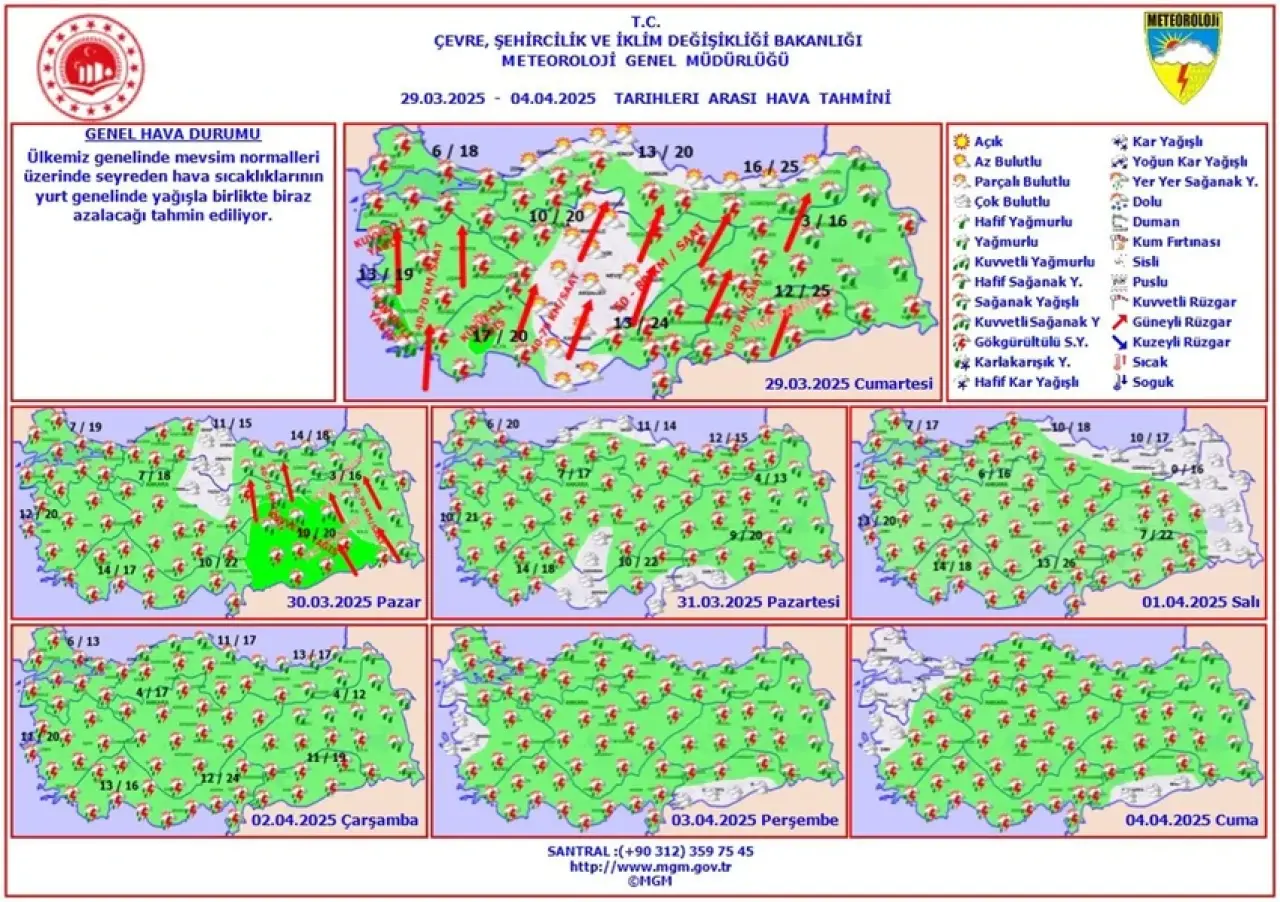 Meteoroloji Genel Müdürlüğü tarafından yapılan tahminlere göre: Ülkemiz genelinin parçalı ve çok bulutlu, Marmara, Ege, Akdeniz (Mersin hariç), Karadeniz’in iç kesimleri, Doğu ve Güneydoğu Anadolu ile Ankara, Eskişehir, Çankırı, Sivas, Ordu, Giresun, Trabzon ve Rize çevrelerinin sağanak ve gök gürültülü sağanak yağışlı geçeceği tahmin ediliyor. Yağışların; Batı Akdeniz’in iç kesimleri, Muğla’nın batısı, Aydın kıyıları, Balıkesir'in batısı ile İzmir'in güney ilçelerinde yerel kuvvetli olması bekleniyor. Rüzgarın; Ege, Akdeniz’in iç kesimleri, İç Anadolu’nun güney ve doğusu, Orta ve Doğu Karadeniz’in iç kesimleri ile Doğu ve Güneydoğu Anadolu’nun batısında güneyli yönlerden kuvvetlİ, İç Anadolu’da kısa süreli fırtına şeklinde (40-70 km/saat) esmesi bekleniyor. Güneydoğu Anadolu Bölgesi’nin güneyinde toz taşınımı bekleniyor.