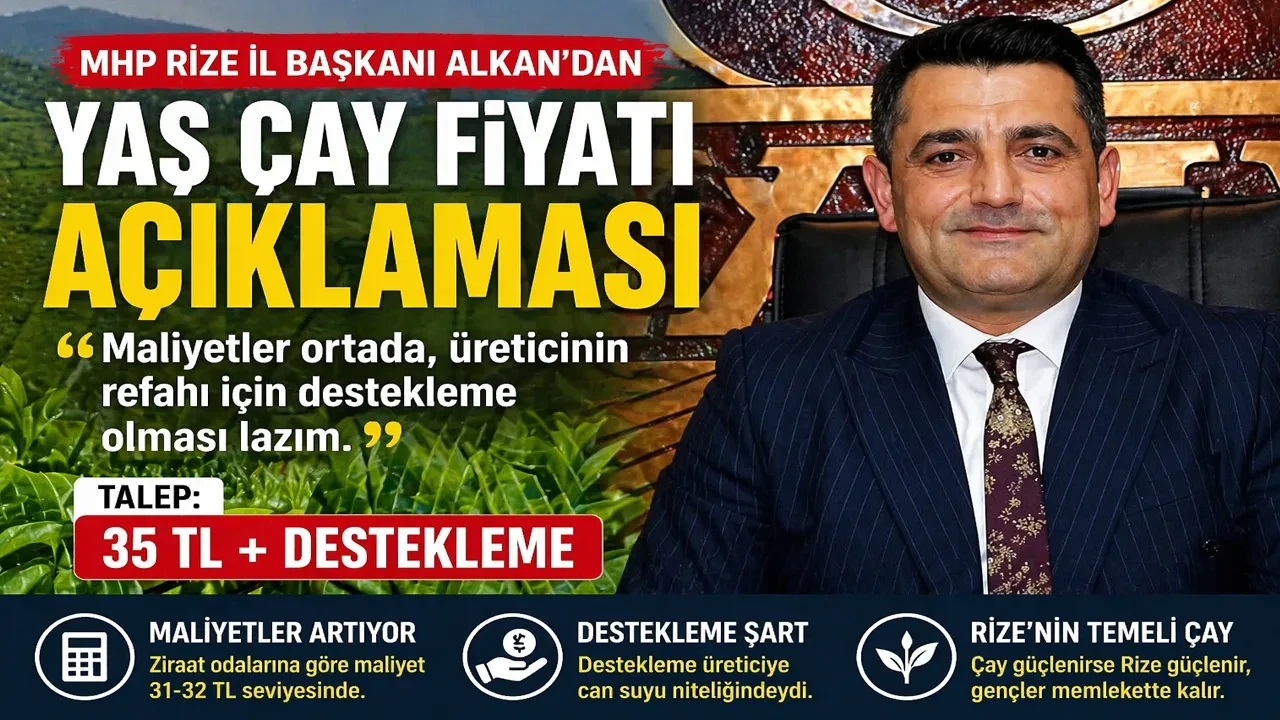 Milliyetçi Hareket Partisi (MHP) Rize İl Başkanı İhsan Alkan, 2026 yılı yaş çay kampanya dönemi öncesinde düzenlediği basın toplantısında üreticinin beklentilerini ve artan maliyetleri gündeme taşıdı. Alkan, yaş çay için destekleme hariç 35 TL taban fiyat talep ettiklerini belirterek, üreticinin refahının korunması için ek desteklerin yeniden hayata geçirilmesi gerektiğini vurguladı.