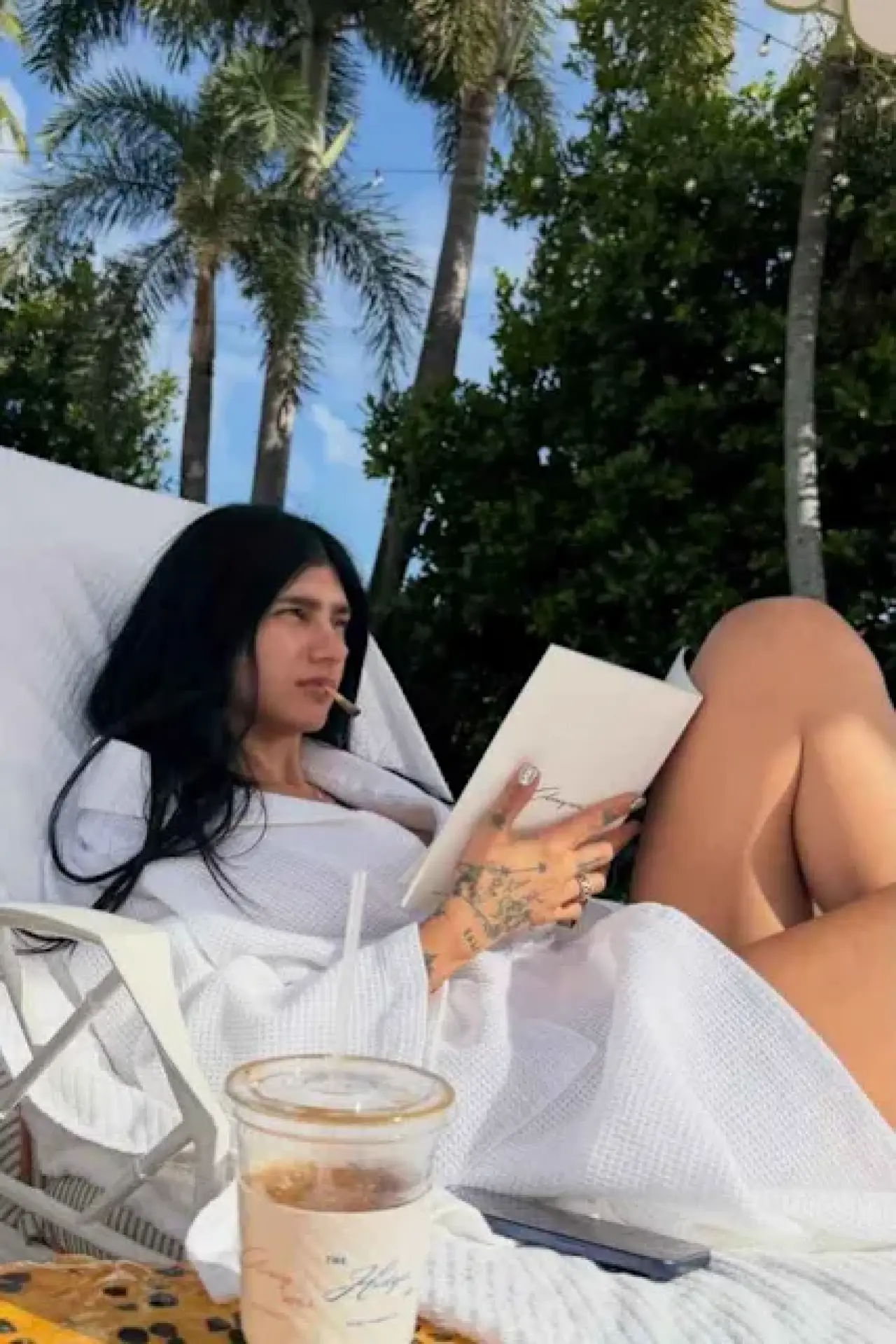 Eski yetişkin film yıldızı yeni fotoğrafında sadece sade beyaz bir bornoz giyiyor ve bu da görünüme rahat ve konforlu bir hava katıyor. Bornoz bol ve yumuşak, rahat bir dış mekan ortamı için mükemmel. Bir bacağı bükülmüş halde şezlongda oturmuş, kitap okuyor ve sigara içiyor.