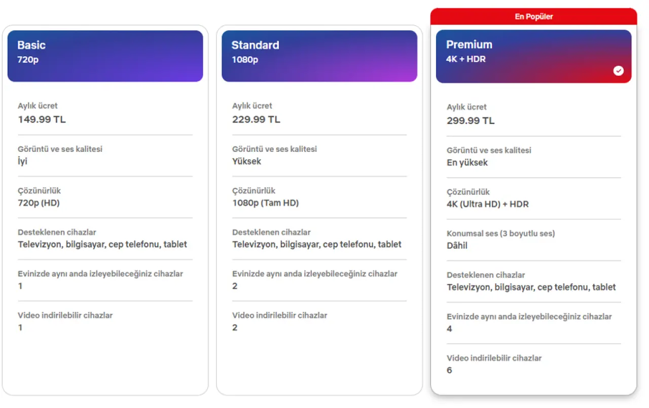 Netflix sunduğu sistemde birbirinden farklı özelliklere sahip üç ayrı abonelik opsiyonu sunuyor. Temel, standart ve özel paket özellikleri şu şekilde: