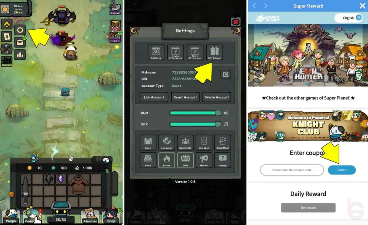 To exchange a coupon code in Pompo Backpack Heroes, follow the steps below: