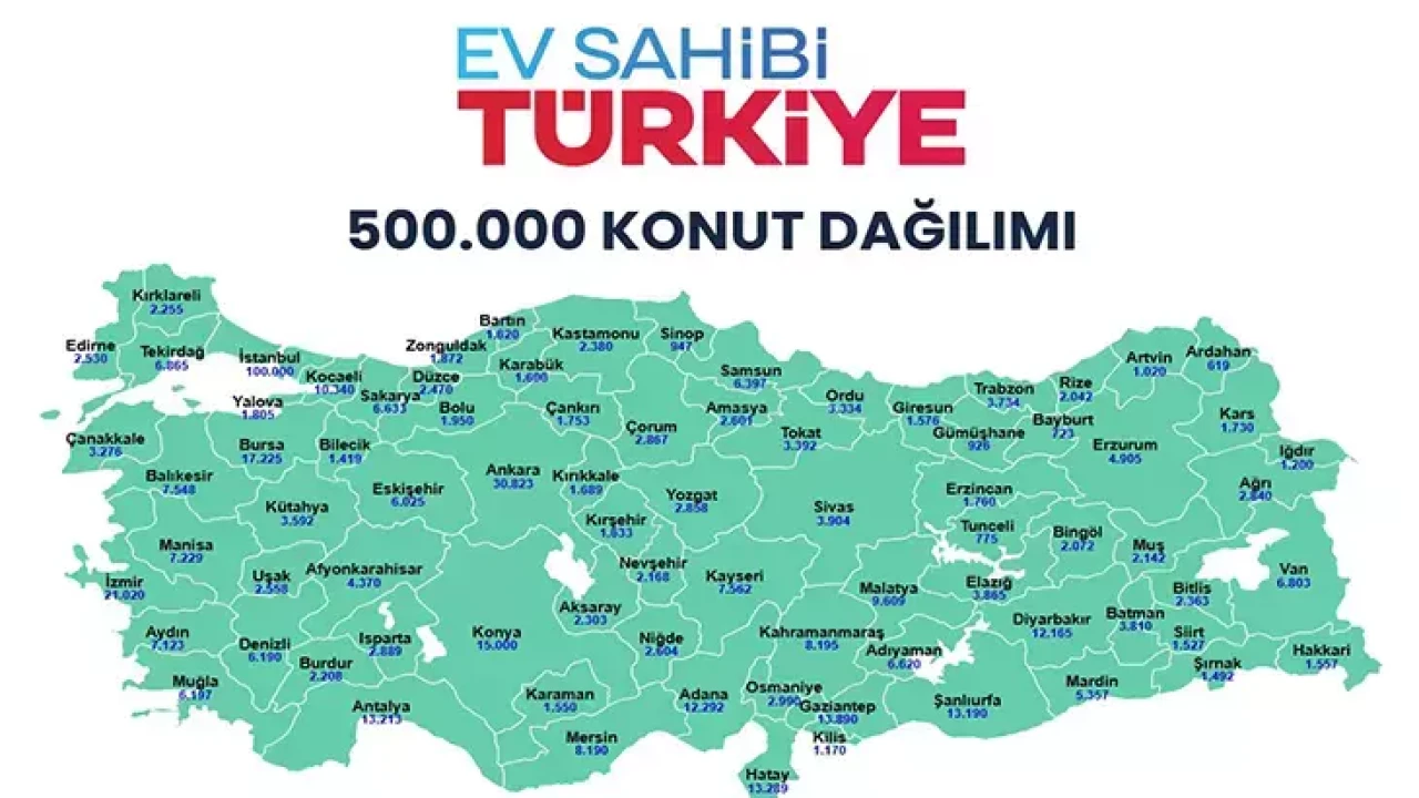 Türkiye tarihinin en büyük sosyal konut hamlesi kapsamında, 81 ilde 500 bin konut yapılacağı ilçeler belli oldu. Çevre, Şehircilik ve İklim Değişikliği Bakanlığı'nın değerlendirmeleri sonucunda, konut fiyatlarının dengelenmesi ve dar gelirli vatandaşların ev sahibi olmasını hedefleyen "Yüzyılın Konut Projesi" kapsamında, illerin nüfus yoğunluğu dikkate alınarak konut sayıları belirlendi. Konutlar, Toplu Konut İdaresi Başkanlığı (TOKİ) eliyle, 2+1 ve 1+1 şeklinde, yatay mimari ve geleneksel mahalle dokusuna uygun olarak inşa edilecek.