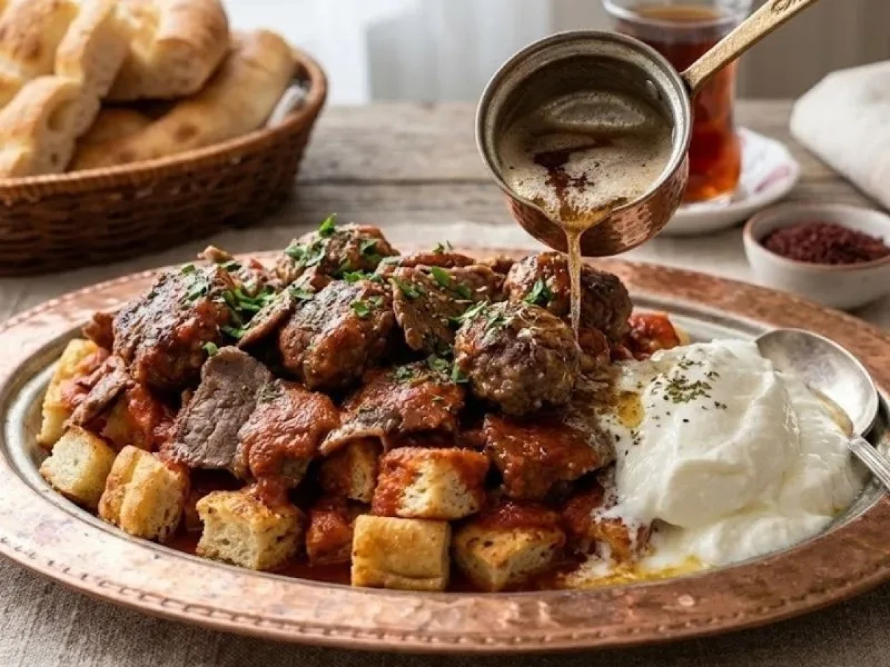 Bayat pideler küp küp doğranarak tereyağında hafifçe çevrildikten sonra et suyu ve domates sosuyla buluşturuluyor. Üzerine köfte, döner ya da sote et eklenerek ev yapımı İskender lezzeti hazırlanabiliyor.