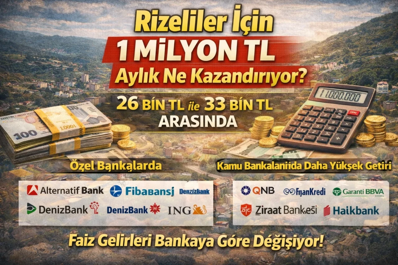 Rize’de birikimlerini güvenli liman olarak görülen mevduatta değerlendiren vatandaşlar, hangi bankanın ne kadar kazandırdığını yakından takip ediyor. Güncel oranlara göre 1 milyon TL’nin 32 günlük vadede sağladığı net kazanç, bankaya göre 26 bin TL ile 33 bin TL arasında değişiyor.