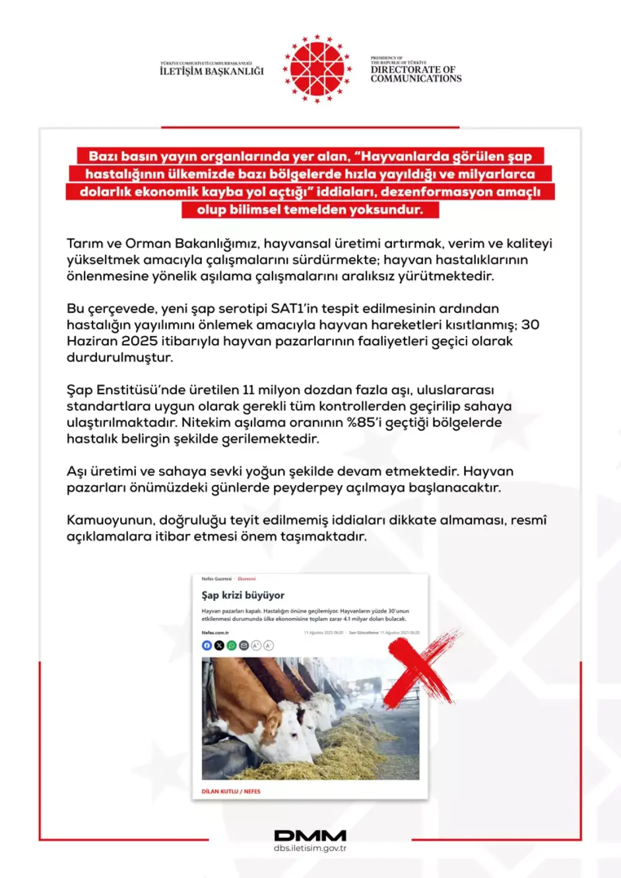 İletişim Başkanlığı Dezenformasyonla Mücadele Merkezi (DMM), bazı basın yayın organlarında yer alan, "Hayvanlarda görülen şap hastalığının ülkemizde bazı bölgelerde hızla yayıldığı ve milyarlarca dolarlık ekonomik kayba yol açtığı" iddialarına ilişkin açıklamada bulundu.