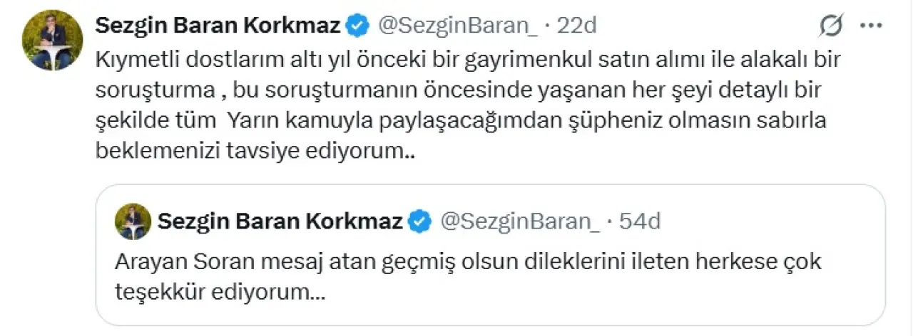 Sezgin Baran Korkmaz konuya dair sosyal medya hesabından yaptığı ilk açıklamda; "Kıymetli dostlarım altı yıl önceki bir gayrimenkul satın alımı ile alakalı bir soruşturma , bu soruşturmanın öncesinde yaşanan her şeyi detaylı bir şekilde tüm Yarınkamuyla paylaşacağımdan şüpheniz olmasın sabırla beklemenizi tavsiye ediyorum.. " ifadelerini kullandı.