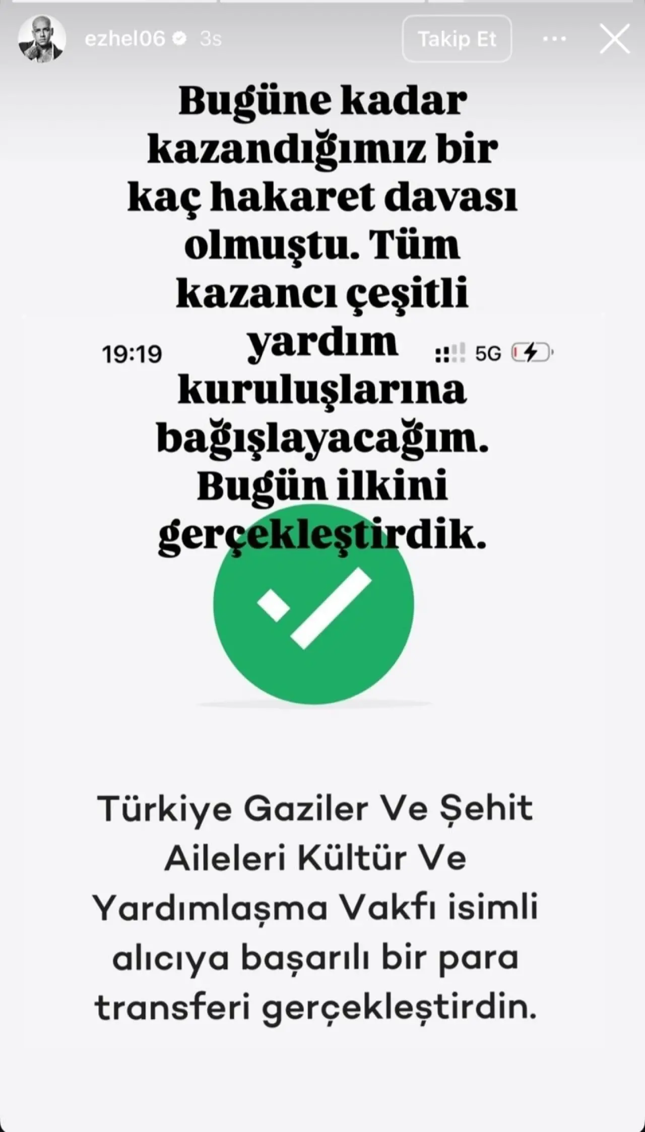 TÜGŞAV'dan yapılan açıklamada, 'Ezhel ismiyle bilinen bir sanatçı kazandığı bir hakaret davasından aldığı tazminatı vakfımıza bağışlamıştır.