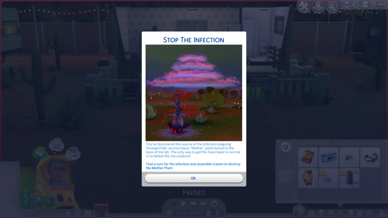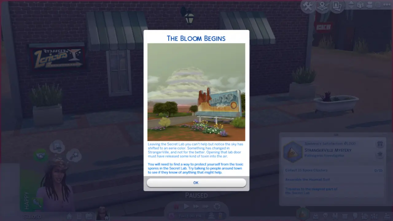 StrangerVille'e ilk vardığınızda, her şey pek de yolunda görünmüyor. Bu kasabada garip bir şeyler oluyor. Şehirdeki Sim'lere StrangerVille hakkında sorular sorarak başlayın. Her türlü Sim'e sorduğunuzdan emin olun; Curio Shop Sahibi, Komplo Teorisyenleri, Bilim İnsanları, Askeri Personel, Ele Geçirilmiş Sim'ler ve Siviller. Her birinin sizinle paylaşacakları benzersiz bilgileri olacak. Şehirdeki birkaç kişiye sorduktan sonra, bir şey belirginleşiyor; her şey şehrin dışında bir kraterde bulunan Gizli Laboratuvar'ı işaret ediyor gibi görünüyor. Daha fazla araştırma yapmak için Gizli Laboratuvar'a gidin.