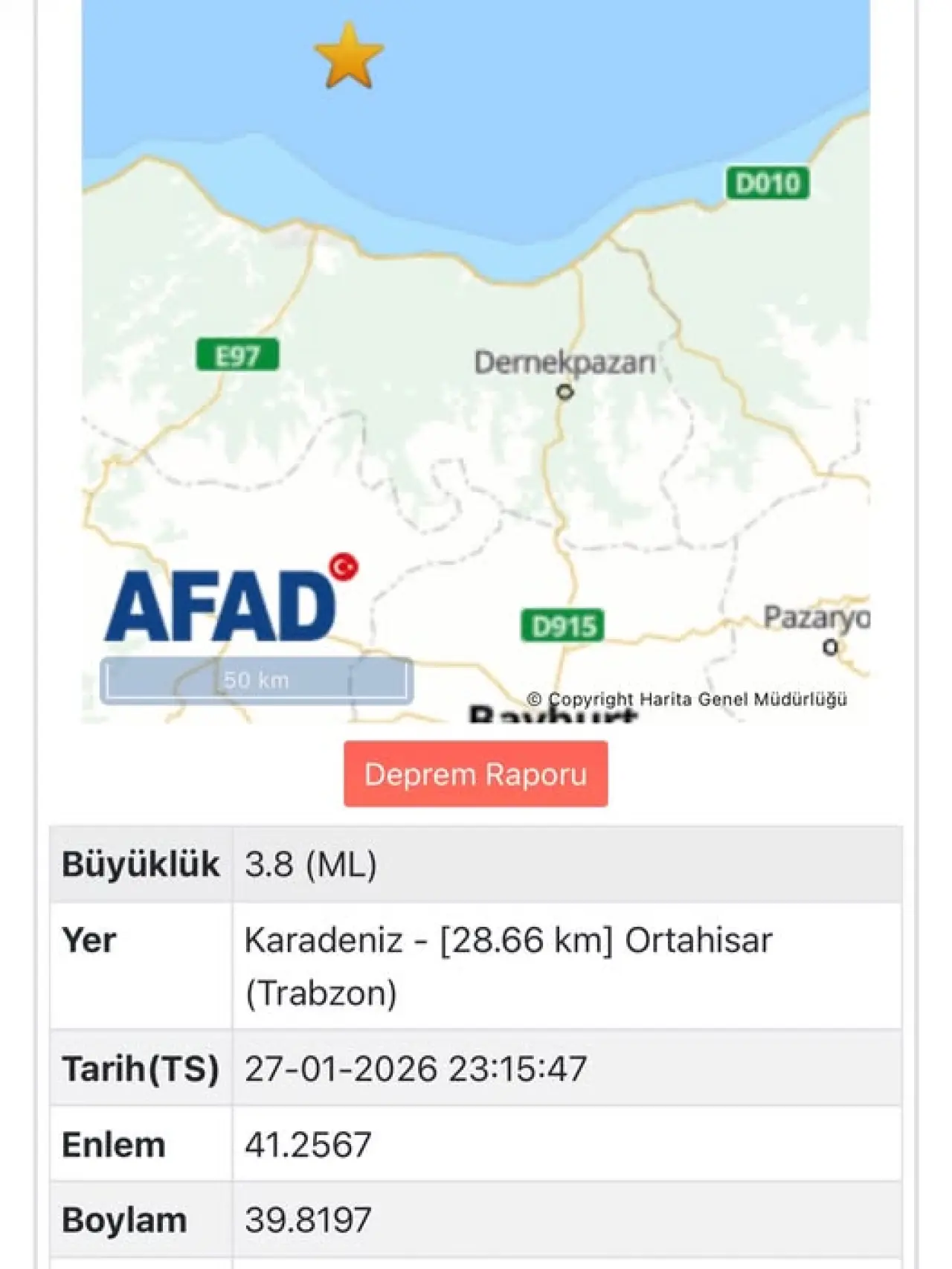 Kandilli Rasathanesi’nin verilerine göre deprem, 27 Ocak 2026 tarihinde saat 23.15’te meydana geldi. Karadeniz açıklarında kaydedilen depremin büyüklüğü 3.7 olarak ölçülürken, yerin 9.6 kilometre derinliğinde gerçekleştiği bildirildi.
