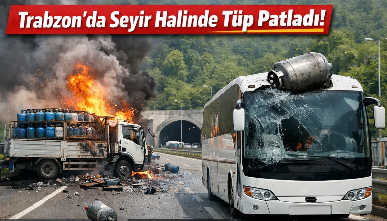 Trabzon’un Sürmene ilçesinde tüp yüklü bir kamyonda bulunan tüplerden biri seyir halindeyken büyük bir gürültüyle patladı. Patlamanın şiddetiyle savrulan tüp parçaları, yan şeritte ilerleyen bir yolcu otobüsünün üzerine düştü.