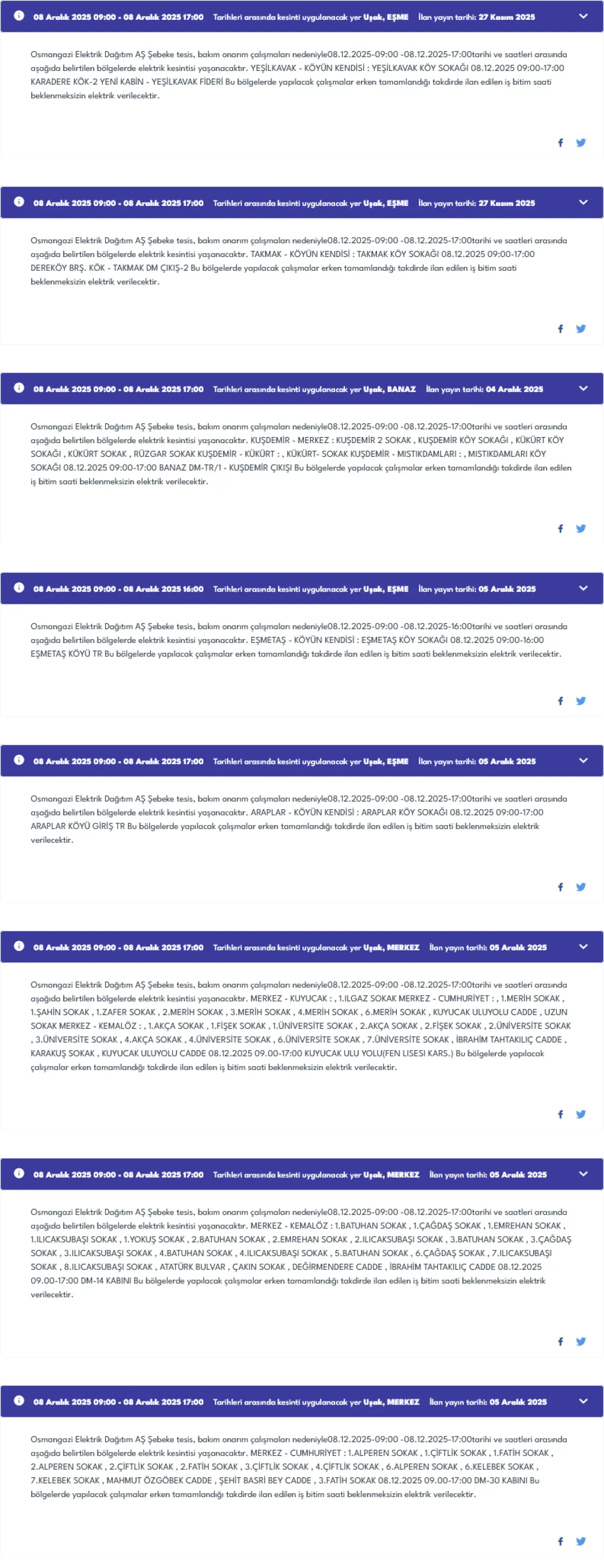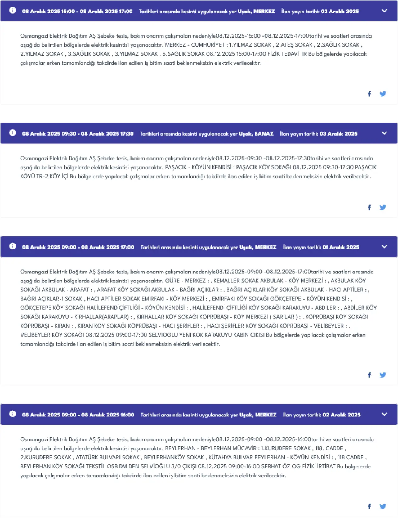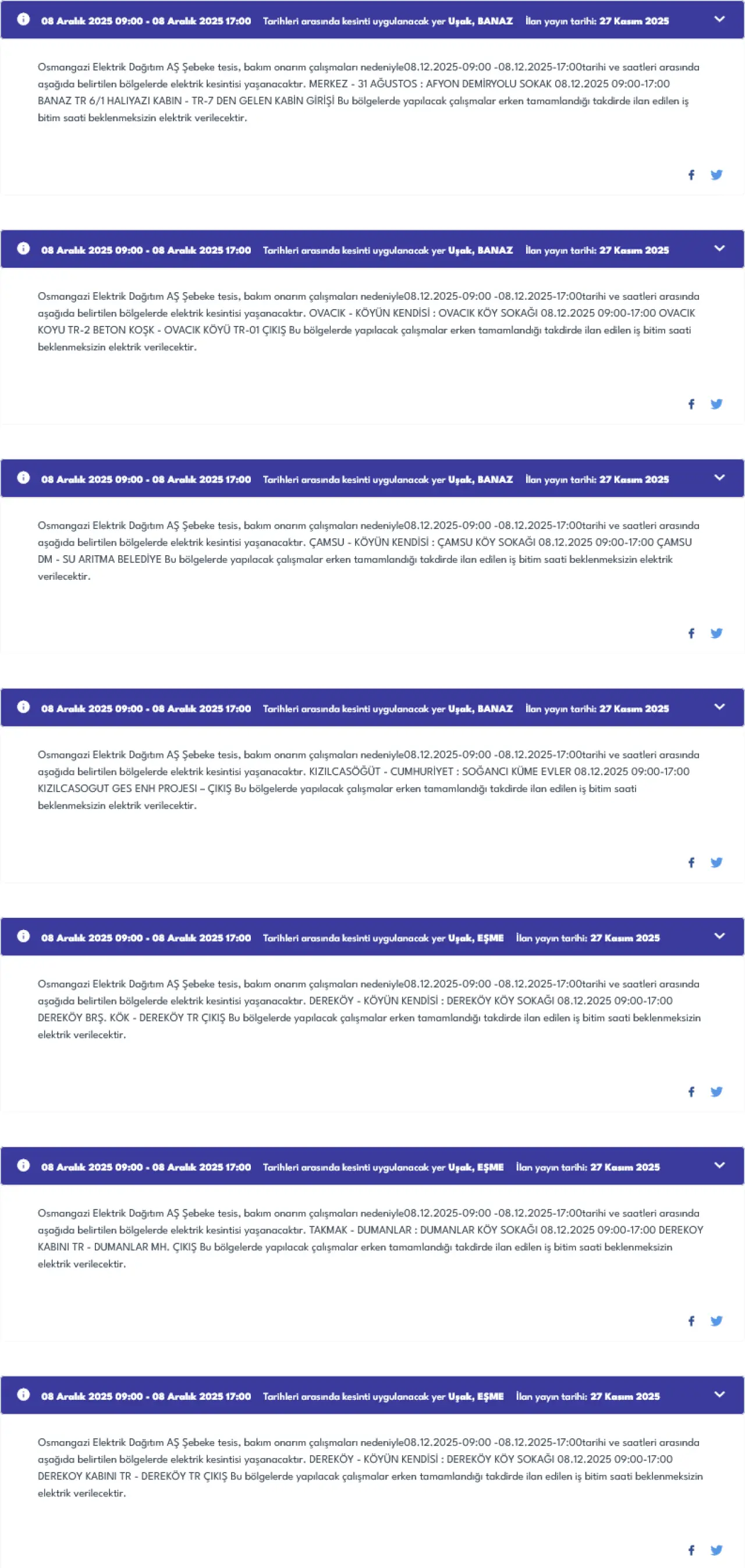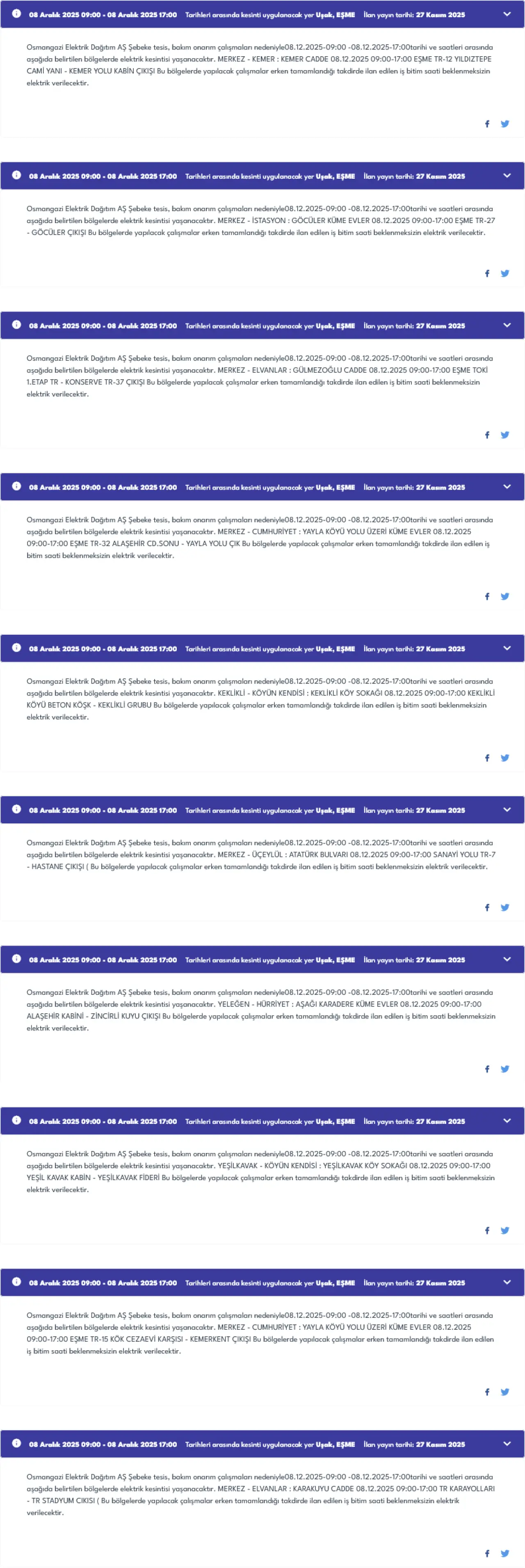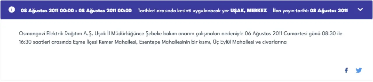 Eşme ilçesinde ise üç farklı lokasyonda kesinti olacak. Dereköy ve Takmak köyüne bağlı Dumanlar Mahallesi 09:00-17:00 saatleri arasında 8 saat boyunca elektriksiz kalacak.