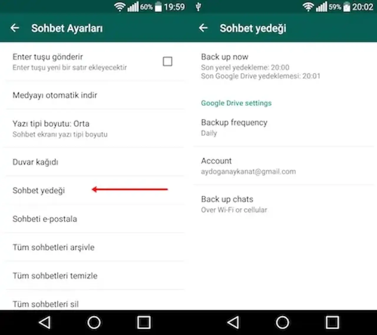 WhatsApp mesaj yedekleme işlemi, Whatsapp’ta bulunan tüm sohbet geçmişiniz ve medyalarınızın Google üzerinde yedeklenmesi işlemidir. WhatsApp’a numaranızla ilk üye olduğunuzda sizden bağlanmasını istediğiniz bir Gmail hesabı sorar.