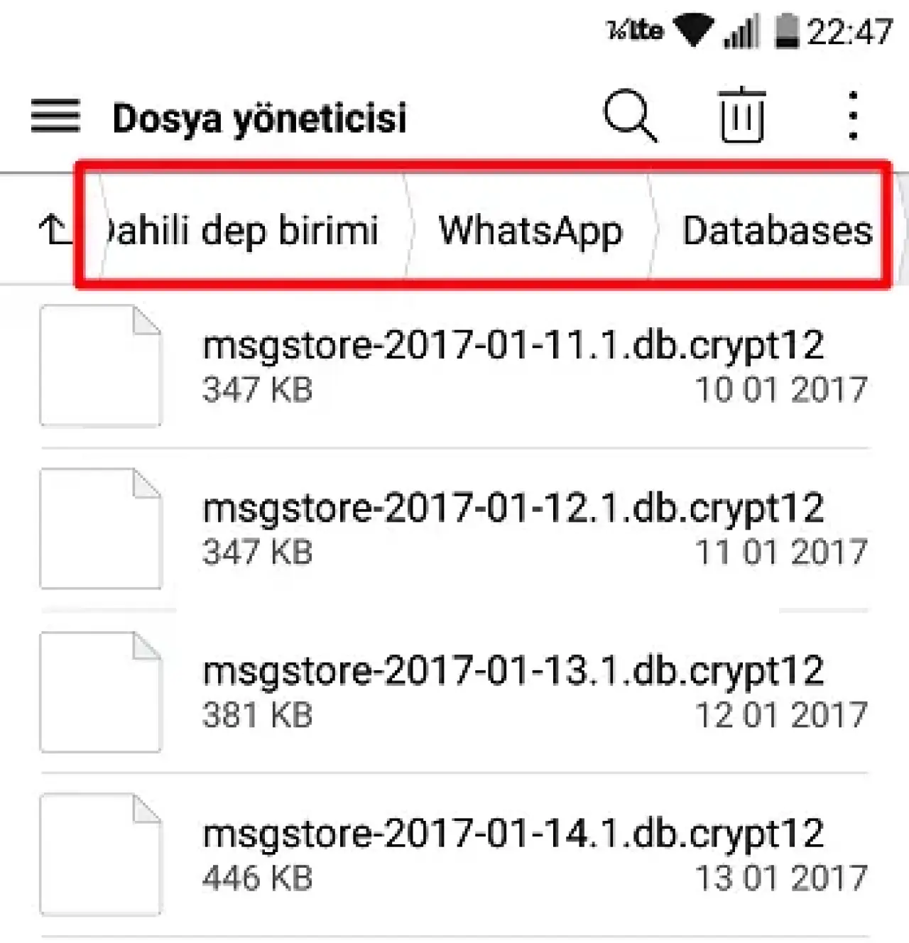 - Tarih ismi ile kayıt edilmiş olan klasörü, “msgstore.db.crypt12” olarak değiştirin.