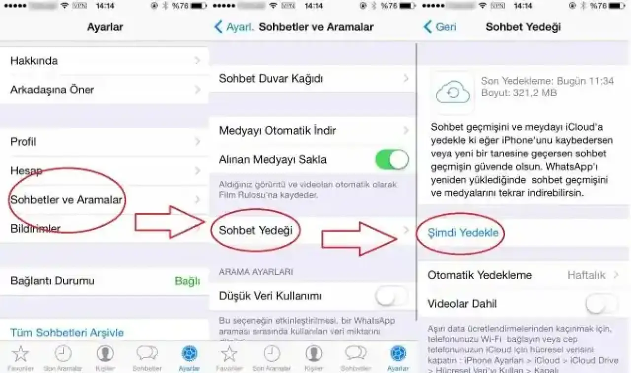 IOS, WhatsApp sohbetlerinizi her gece saat 02:00’da otomatik yedekleme sistemini kullanarak iPhone cihazınıza giriş yapmakta kullandığınız iCloud hesabınıza aktarır. Bu aktarım işlemi aynı zamanda WhatsApp sohbet yedeğinizin otomatik olarak tutulduğu anlamına da gelmektedir. Anlık olarak sohbet yedeği almak istediğinizde veya tüm yedeklerinizi sadece manuel olarak yapmak istediğinizde takip etmeniz gereken adımlar sırasıyla şöyledir: