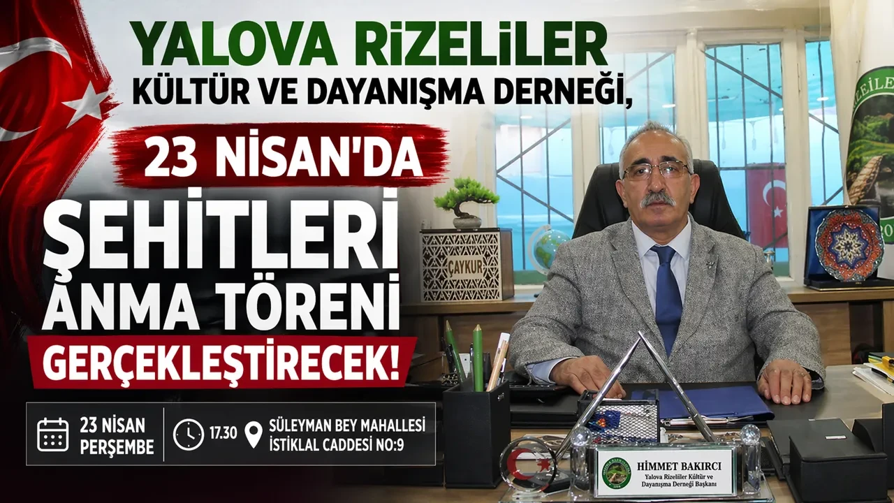 Yalova’da faaliyetlerini sürdüren Yalova Rizeliler Kültür ve Dayanışma Derneği, 23 Nisan’da şehitler anısına anlamlı bir programa imza atmaya hazırlanıyor. Dernek tarafından organize edilen etkinliğin, şehitlerin aziz hatıralarını yaşatmak ve toplumda birlik beraberlik duygusunu güçlendirmek amacıyla gerçekleştirileceği bildirildi.