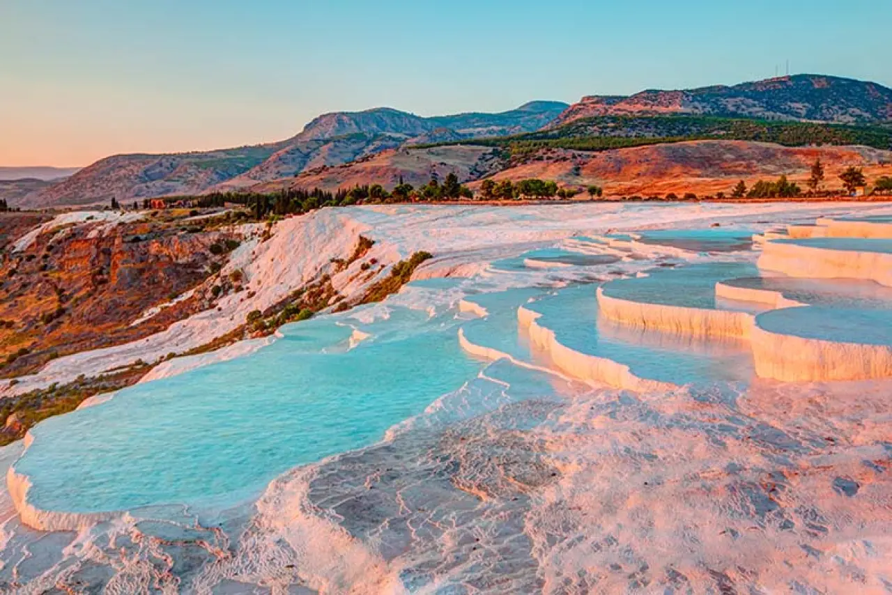 Pamukkale Travertenleri, termal su kaynaklarının yarattığı bir doğa harikası. Nefes kesen güzellikteki beyaz travertenler, donmuş bir şelaleyi andırıyor. Merdivenleri andıran kademeli şekilleri ise Pamukkale Travertenleri’nin güzelliğine güzellik katıyor. Travertenlerin yakınlarında yer alan ve şifa kaynağı kabul edilen termal kaynaklardan yararlanabileceğiniz tesisler de var.