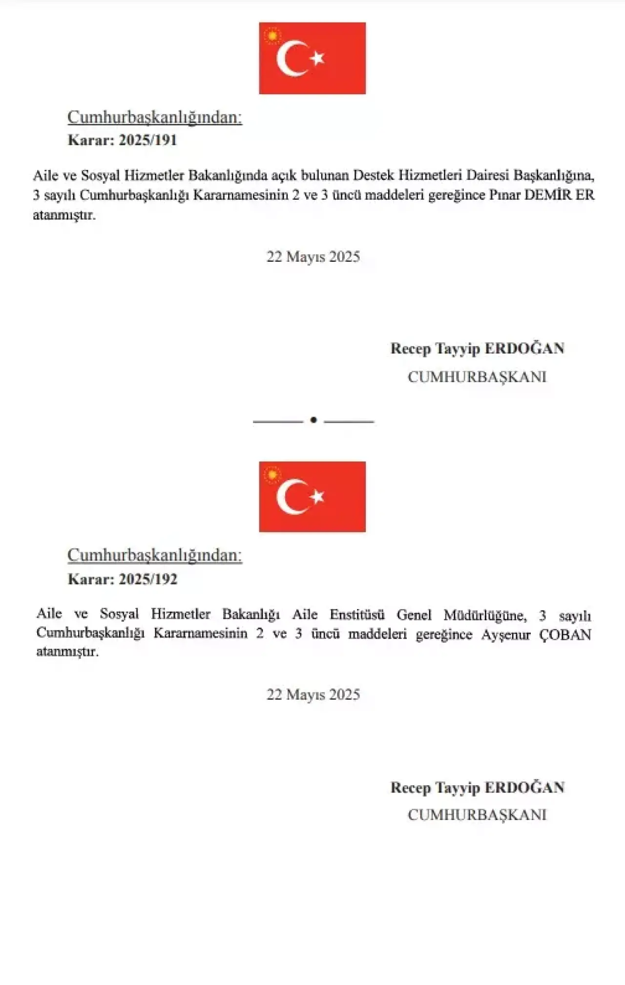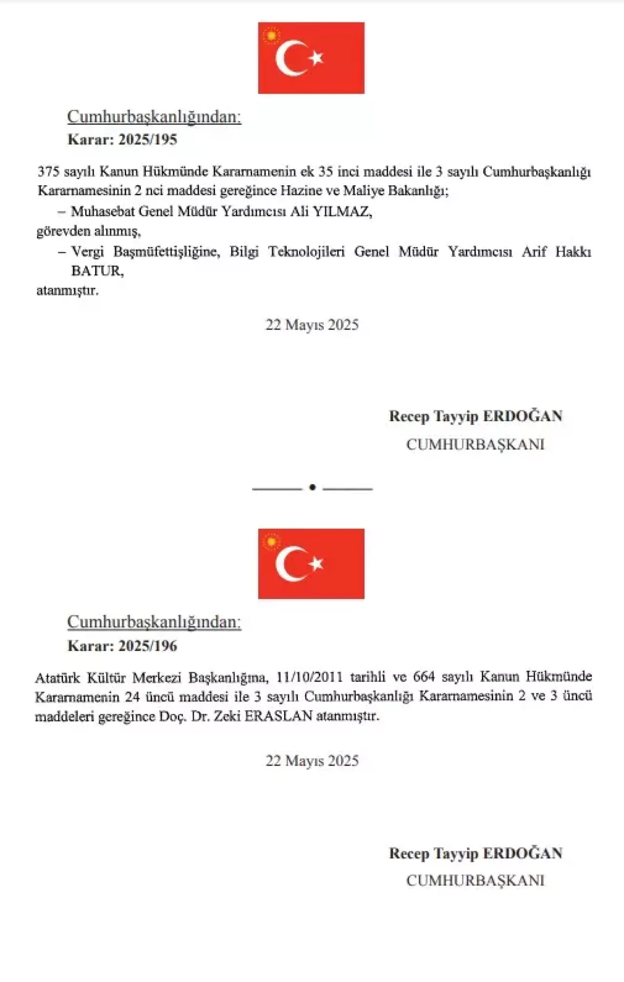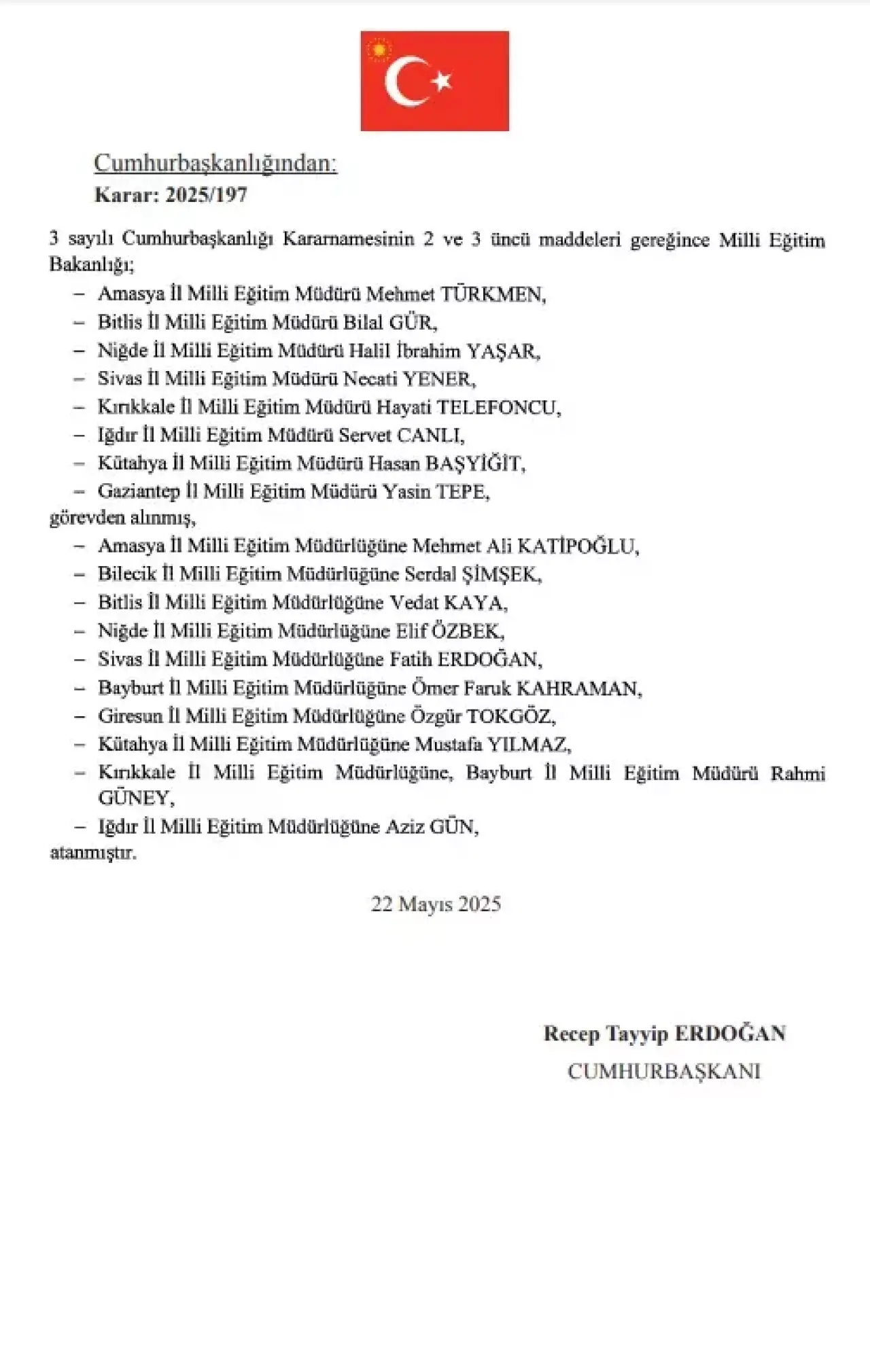 Son dakika atama haberleri: Cumhurbaşkanı Recep Tayyip Erdoğan'ın imzasıyla yayımlanan 23 Mayıs Cuma Resmi Gazete kararlarına göre, 13 ilin İl Milli Eğitim Müdürlüğü ve bazı devlet kurumlarına yeni atamalar gerçekleştirildi.
