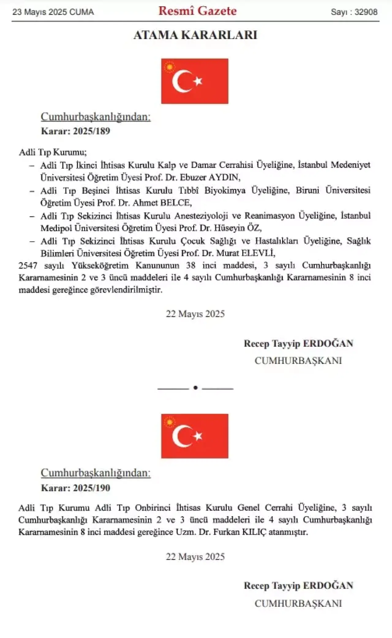 Yayımlanan karara göre, Adli Tıp İkinci İhtisas Kurulu Kalp ve Damar Cerrahisi Üyeliğine İstanbul Medeniyet Üniversitesi Öğretim Üyesi Prof. Dr. Ebuzer Aydın, Adli Tıp Beşinci İhtisas Kurulu Tıbbi Biyokimya Üyeliğine Biruni Üniversitesi Öğretim Üyesi Prof. Dr. Ahmet Belce, Adli Tıp, Sekizinci İhtisas Kurulu Anesteziyoleji ve Reanimasyon Üyeliğine İstanbul Medipol Üniversitesi Öğretim Üyesi Prof. Dr. Murat Elevli, Adli Tıp Onbirinci İhtisas Kurulu Genel Cerrahi Üyeliğine ise Uzm. Dr. Furkan Kılıç atandı.