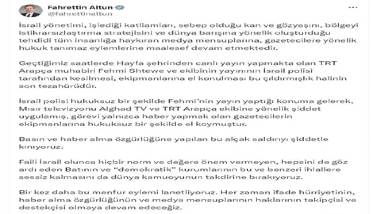 İletişim Başkanı Altun, sosyal medya hesabından yaptığı açıklamada, "İsrail yönetimi, işlediği katliamları, sebep olduğu kan ve gözyaşını, bölgeyi istikrarsızlaştırma stratejisini ve dünya barışına yönelik oluşturduğu tehdidi tüm insanlığa haykıran medya mensuplarına, gazetecilere yönelik hukuk tanımaz eylemlerine maalesef devam etmektedir. Geçtiğimiz saatlerde Hayfa şehrinden canlı yayın yapmakta olan TRT Arapça muhabiri Fehmi Shtewe ve ekibinin yayınının İsrail polisi tarafından kesilmesi, ekipmanlarına el konulması bu çıldırmışlık halinin son tezahürüdür. İsrail polisi hukuksuz bir şekilde Fehmi'nin yayın yaptığı konuma gelerek, Mısır televizyonu Alghad TV ve TRT Arapça ekibine yönelik şiddet uygulamış, görevi yalnızca haber yapmak olan gazetecilerin ekipmanlarına hukuksuz bir şekilde el koymuştur" dedi.