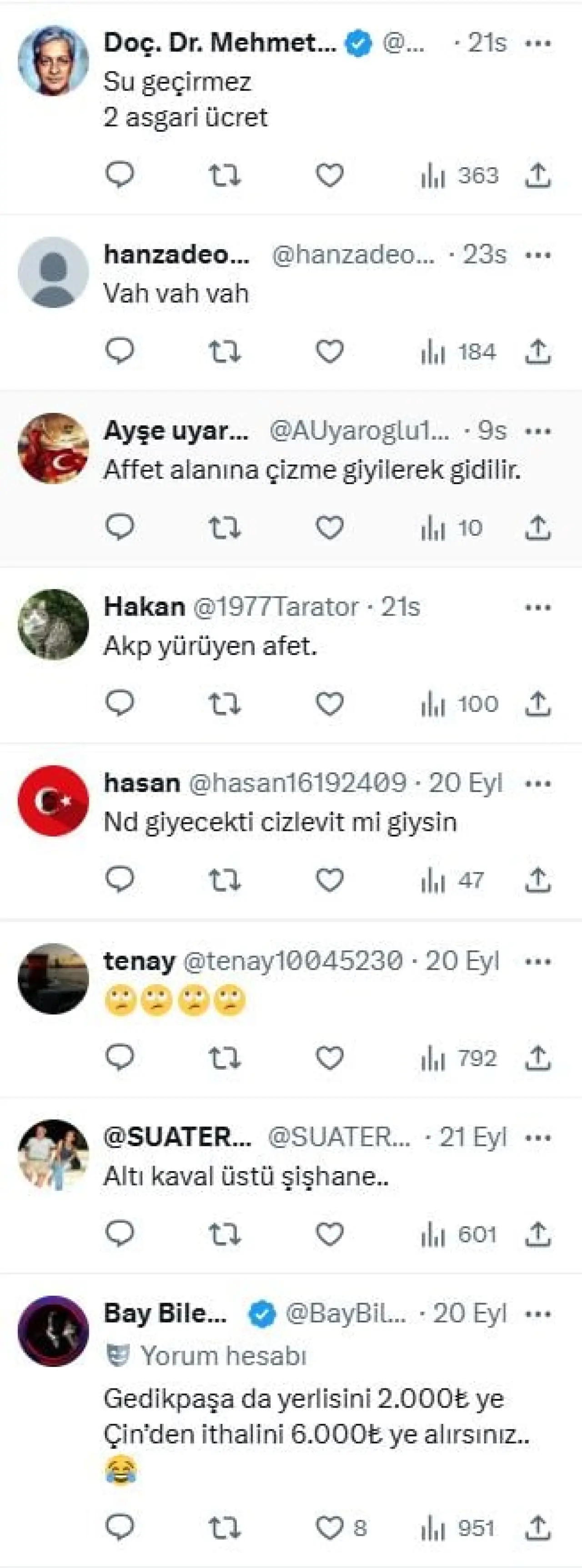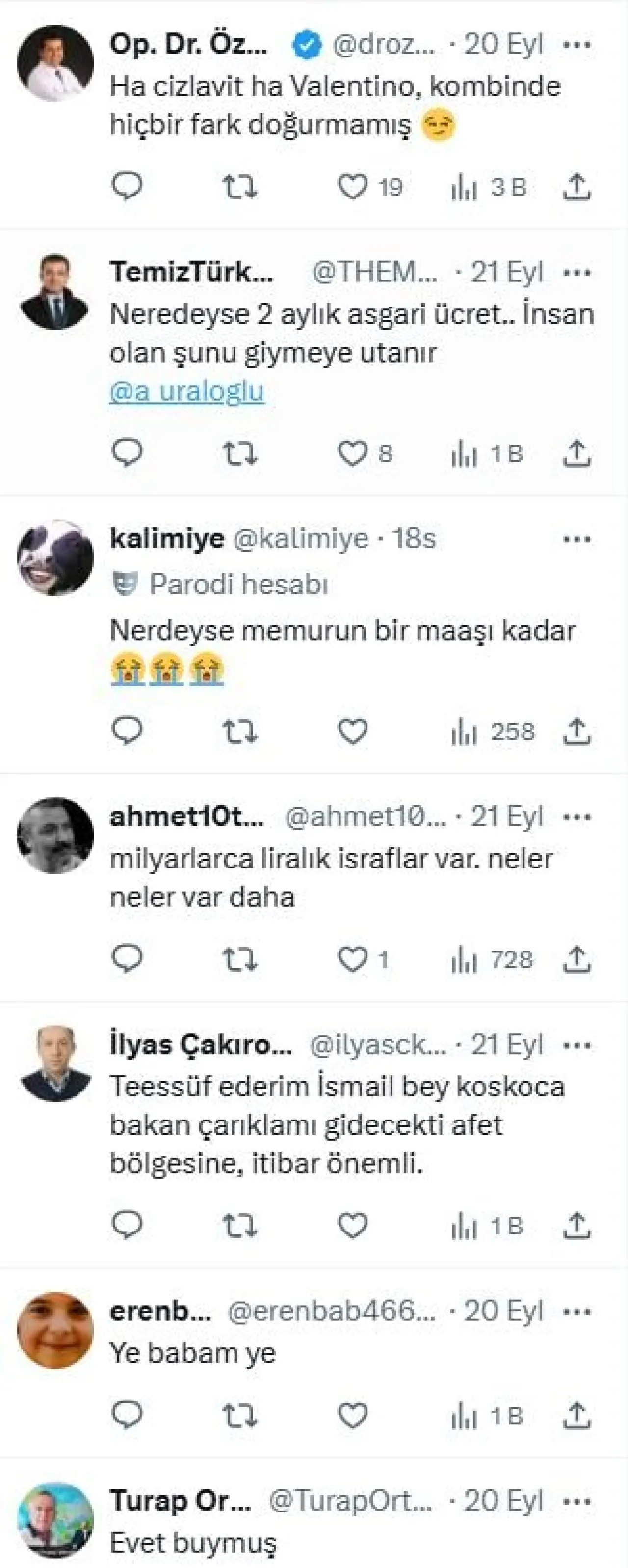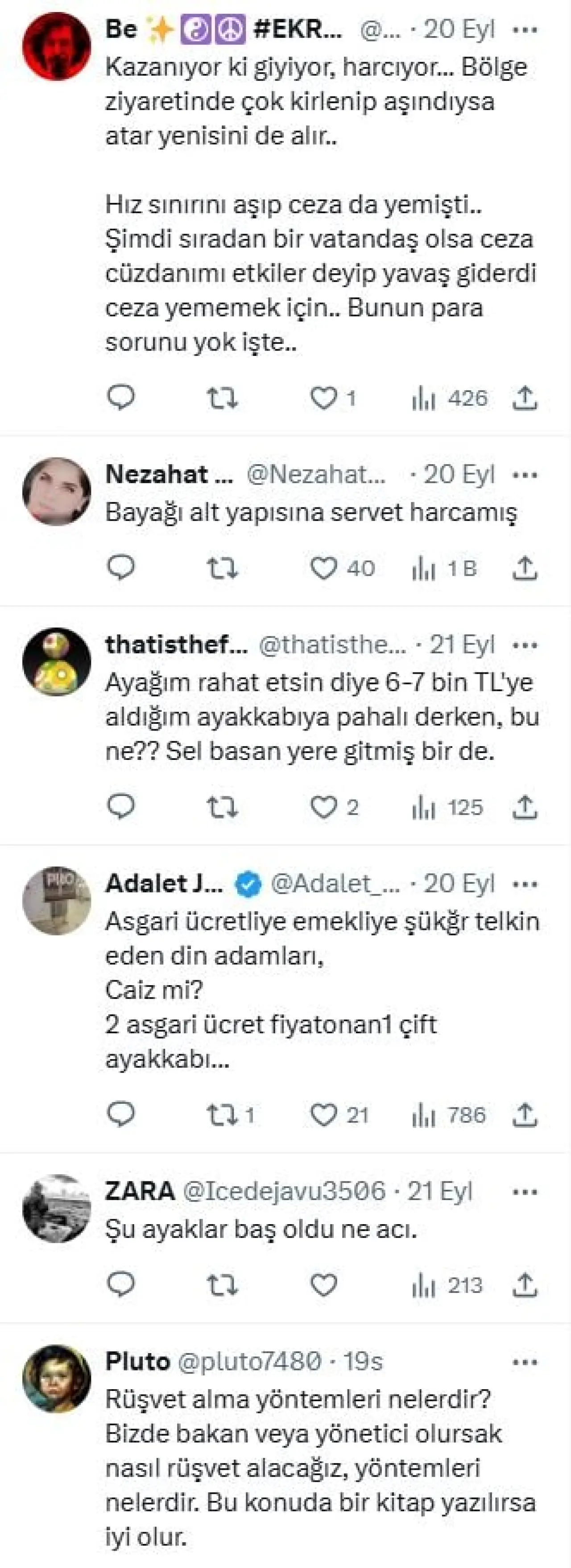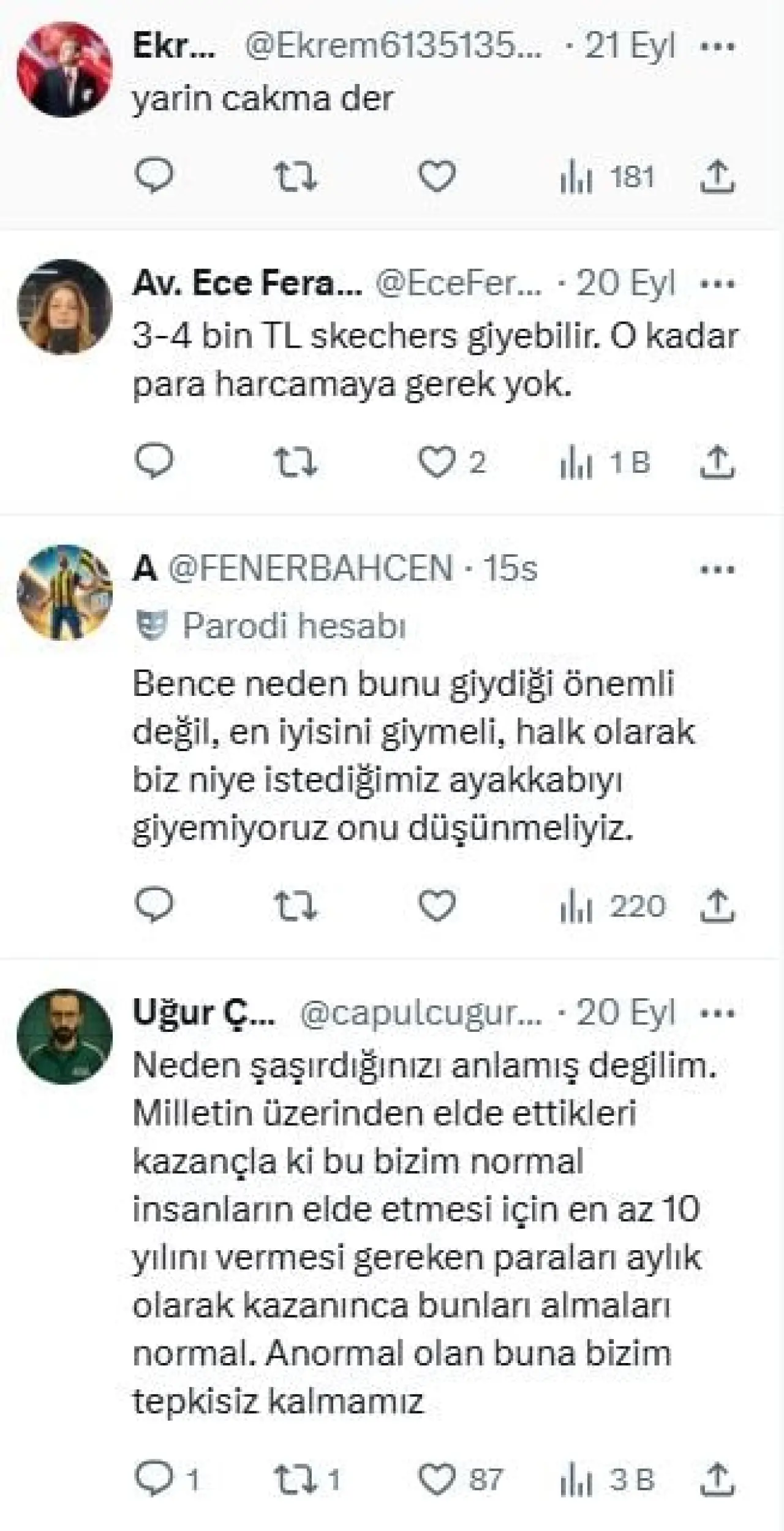 İki asgari ücrete denk gelen ayakkabının fiyatı, ekonomik zorluk yaşayan halk arasında tartışma yarattı. Sosyal medyada, “Millet çocuğuna beslenme koyamıyor, Bakan 44 bin liralık ayakkabıyla geziyor” ve “Emeklinin üç maaşını ayağına giyen halden anlar mı?” gibi yorumlar öne çıktı. Bazıları, “İtibardan tasarruf olmaz” diyerek ironik bir dille durumu eleştirirken, diğerleri Bakan’ın lüks tercihlerini Müslüman ahlakına uygun bulmadı.