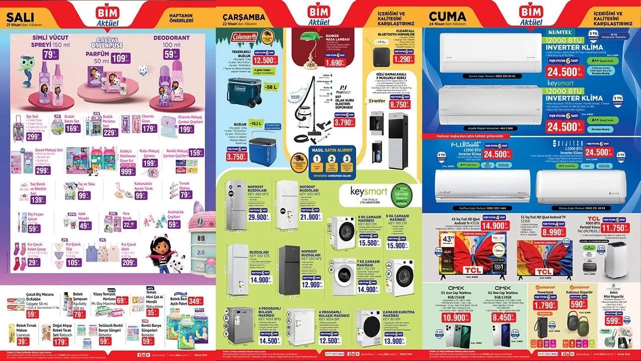 BİM, 21, 22 ve 24 Nisan 2026 tarihlerini kapsayan yeni ürün kataloğu ile alışveriş severlerin dikkatini dağıtmayı başardı. Milyonlarca müşterisinin merakla beklediği bu katalogda birçok indirimli ürün öne çıkıyor. Türkiye genelinde geniş bir şube ağına sahip olan bu market zinciri, yaz sezonunun yaklaşmasıyla birlikte klima, çadır gibi ürünleri uygun fiyatlarla tüketicilere sunmayı planlıyor.