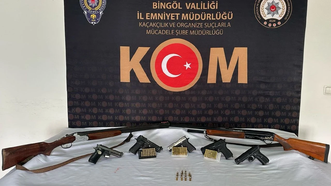 Bingöl İl Emniyet Müdürlüğü Kaçakçılık ve Organize Suçlarla Mücadele (KOM) Şube Müdürlüğü ekiplerince, silah kaçakçılığı ve silah ticareti suçlarına yönelik olarak düzenlenen operasyonda, bir evde yapılan aramada 3 tabanca, 3 şarjör, 2 kurusıkı tabanca, 2 ruhsatsız av tüfeği, 147 fişek ve mermi ele geçirilirken, olayla ilgili olarak 8 şüpheli şahıs yakalandı. Haklarında adli işlem başlatılan 8 şüpheli şahıstan 2'si tutuklandı.