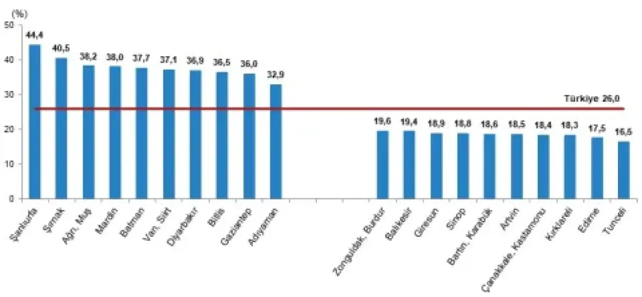 ADNKS sonuçlarına göre 2023 yılında toplam hanehalkı sayısı 26 milyon 309 bin 332 oldu. Hanelerin yüzde 43,6'sında 0-17 yaş grubunda en az bir çocuk bulunduğu görüldü. Bu hanelerin illere göre dağılımı incelendiğinde, 0-17 yaş grubunda en az bir çocuk bulunan hanehalkı oranının en yüksek olduğu ilin yüzde 69,0 ile Şanlıurfa, en düşük olduğu ilin yüzde 29,1 ile Tunceli ve Sinop olduğu görüldü.