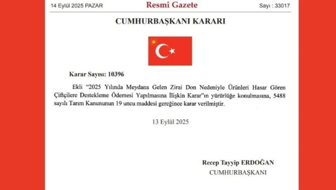Cumhurbaşkanı Recep Tayyip Erdoğan’ın imzasıyla yayımlanan karara göre, 2025 yılında meydana gelen zirai don nedeniyle meyve alanlarında ürünleri zarar gören çiftçilere destekleme ödemesi yapılacak. Resmi Gazete’nin 14 Eylül 2025 tarihli sayısında yayımlanan karar ile, bu yıl meydana gelen zirai don olaylarından etkilenen ve ürünlerinde yüzde 20’nin üzerinde hasar tespit edilen çiftçiler, destekleme ödemelerinden faydalanabilecek. Masraf hesaplamalarında 1 Eylül 2024’ten 13 Nisan 2025’e kadar üreticinin yaptığı masraflar dikkat alındı.