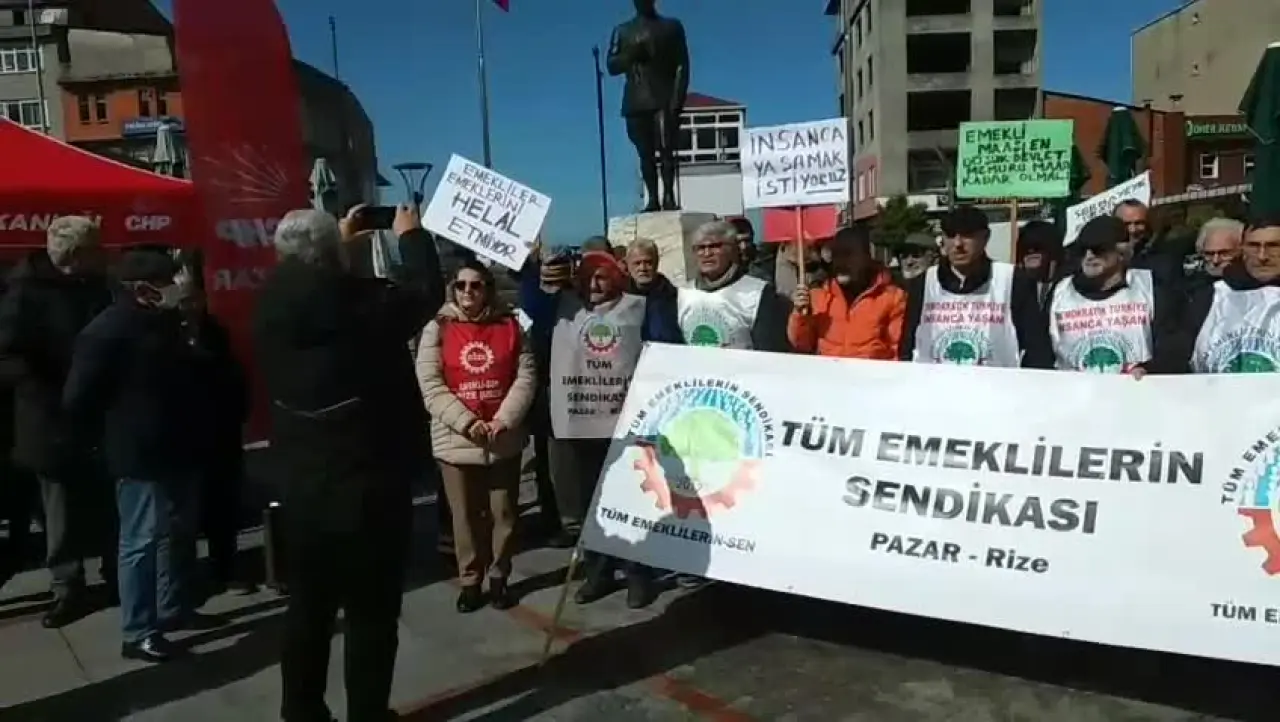 Tüm Emekliler Sendikası Pazar Şubesi'nin çağrısıyla Atatürk Meydanı'nda bir arayan gelen emeklilerin düzenlediği basın açıklamasına CHP Pazar ilçe örgütü, Çay Üreticileri Meclisi üyeleri ve bazı STK temsilcileri de destek verdi.