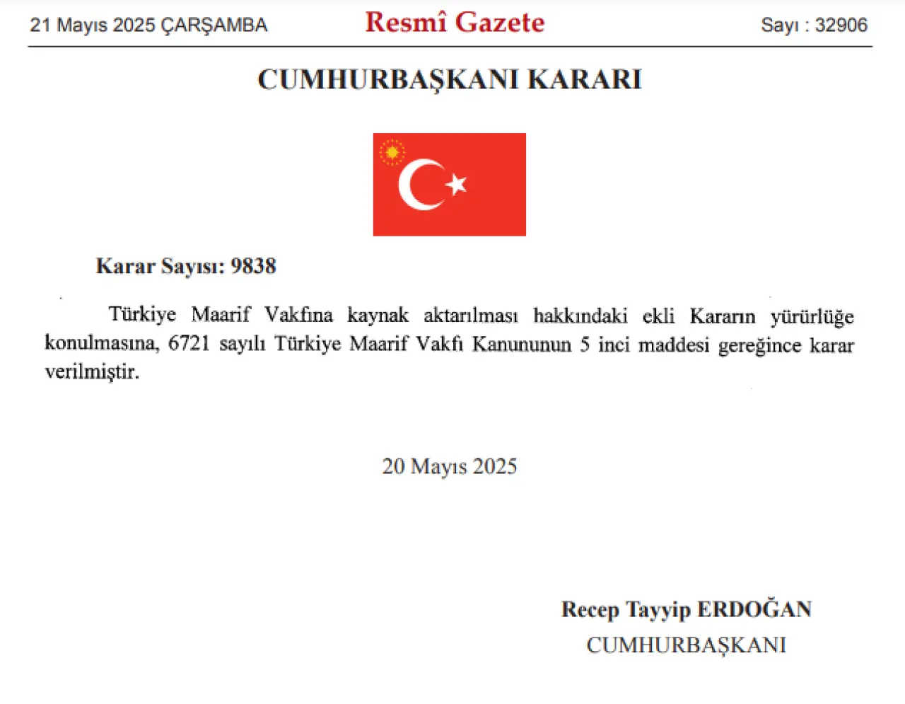 AKP Genel Başkanı ve  Cumhurbaşkanı Tayyip Erdoğan'ın imzasıyla Resmi Gazete'de yayımlanan Cumhurbaşkanı Kararı ile Türkiye Maarif Vakfı'na 2025 yılı için 6 milyar 774 milyon 954 bin TL'ye kadar kaynak aktarılmasına karar verildi.